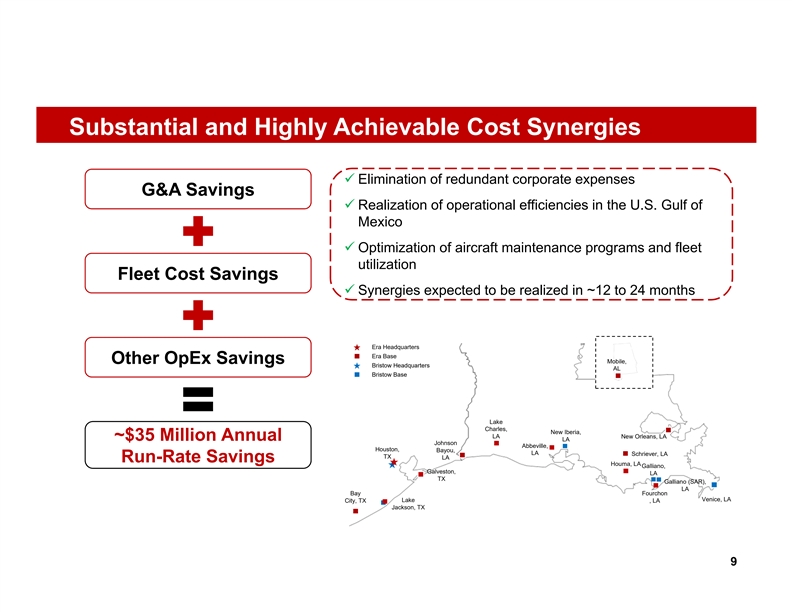 Substantial and Highly Achievable Cost Synergies ü Elimination of redundant corporate expenses G&A Savings ü Realization of operational efficiencies in the U.S. Gulf of Mexico ü Optimization of aircraft maintenance programs and fleet utilization Fleet Cost Savings ü Synergies expected to be realized in ~12 to 24 months Era Headquarters Era Base Other OpEx Savings Mobile, Bristow Headquarters AL Bristow Base Lake Charles, New Iberia, LA New Orleans, LA ~$35 Million Annual LA Johnson Abbeville, Houston, Bayou, LA Schriever, LA TX LA Run-Rate Savings Houma, LA Galliano, Galveston, LA TX Galliano (SAR), LA Fourchon Bay Venice, LA Lake City, TX , LA Jackson, TX 9Substantial and Highly Achievable Cost Synergies ü Elimination of redundant corporate expenses G&A Savings ü Realization of operational efficiencies in the U.S. Gulf of Mexico ü Optimization of aircraft maintenance programs and fleet utilization Fleet Cost Savings ü Synergies expected to be realized in ~12 to 24 months Era Headquarters Era Base Other OpEx Savings Mobile, Bristow Headquarters AL Bristow Base Lake Charles, New Iberia, LA New Orleans, LA ~$35 Million Annual LA Johnson Abbeville, Houston, Bayou, LA Schriever, LA TX LA Run-Rate Savings Houma, LA Galliano, Galveston, LA TX Galliano (SAR), LA Fourchon Bay Venice, LA Lake City, TX , LA Jackson, TX 9