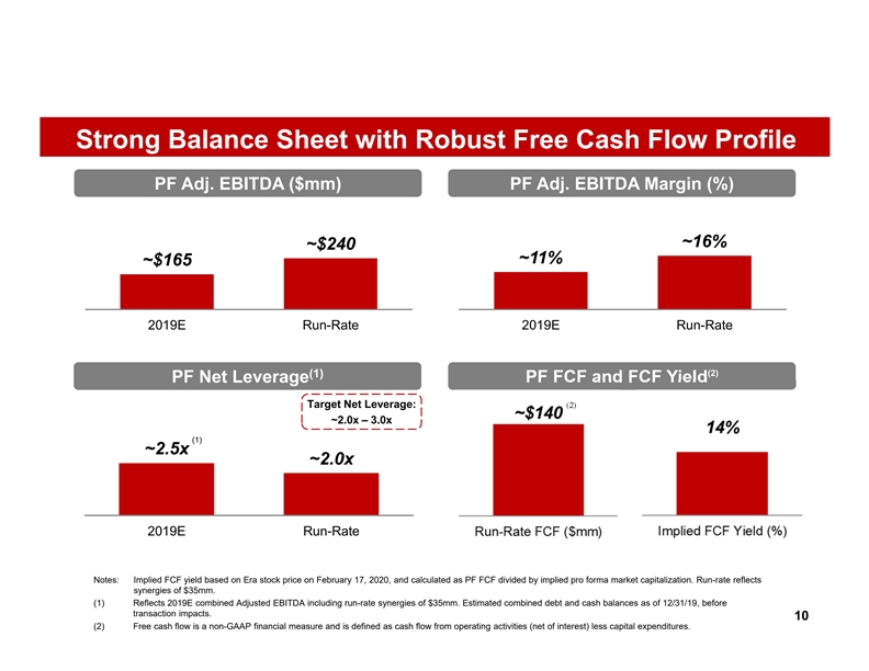 Strong Balance Sheet with Robust Free Cash Flow Profile PF Adj. EBITDA ($mm) PF Adj. EBITDA Margin (%) ~16% ~$240 ~11% ~$165 2019E Run-Rate 2019E Run-Rate (2) (1) PF Net Leverage PF FCF and FCF Yield Target Net Leverage: (2) ~2.0x – 3.0x (1) ~2.5x ~2.0x 2019E Run-Rate Notes: Implied FCF yield based on Era stock price on February 17, 2020, and calculated as PF FCF divided by implied pro forma market capitalization. Run-rate reflects synergies of $35mm. (1) Reflects 2019E combined Adjusted EBITDA including run-rate synergies of $35mm. Estimated combined debt and cash balances as of 12/31/19, before transaction impacts. 10 (2) Free cash flow is a non-GAAP financial measure and is defined as cash flow from operating activities (net of interest) less capital expenditures.Strong Balance Sheet with Robust Free Cash Flow Profile PF Adj. EBITDA ($mm) PF Adj. EBITDA Margin (%) ~16% ~$240 ~11% ~$165 2019E Run-Rate 2019E Run-Rate (2) (1) PF Net Leverage PF FCF and FCF Yield Target Net Leverage: (2) ~2.0x – 3.0x (1) ~2.5x ~2.0x 2019E Run-Rate Notes: Implied FCF yield based on Era stock price on February 17, 2020, and calculated as PF FCF divided by implied pro forma market capitalization. Run-rate reflects synergies of $35mm. (1) Reflects 2019E combined Adjusted EBITDA including run-rate synergies of $35mm. Estimated combined debt and cash balances as of 12/31/19, before transaction impacts. 10 (2) Free cash flow is a non-GAAP financial measure and is defined as cash flow from operating activities (net of interest) less capital expenditures.