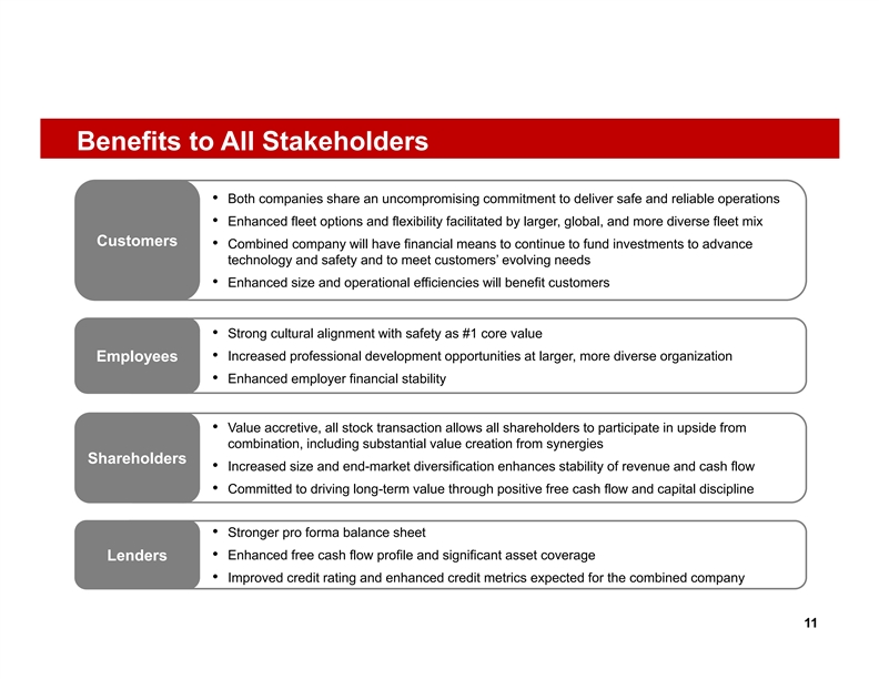 Benefits to All Stakeholders • Both companies share an uncompromising commitment to deliver safe and reliable operations • Enhanced fleet options and flexibility facilitated by larger, global, and more diverse fleet mix Customers Customers • Combined company will have financial means to continue to fund investments to advance technology and safety and to meet customers’ evolving needs • Enhanced size and operational efficiencies will benefit customers • Strong cultural alignment with safety as #1 core value • Increased professional development Employ opportuni ees ties at larger, more diverse organization Employees • Enhanced employer financial stability • Value accretive, all stock transaction allows all shareholders to participate in upside from combination, including substantial value creation from synergies Shareholders Shareholders • Increased size and end-market diversification enhances stability of revenue and cash flow • Committed to driving long-term value through positive free cash flow and capital discipline • Stronger pro forma balance sheet • Enhanced free cash flow profile and significant asset coverage Lenders Lenders • Improved credit rating and enhanced credit metrics expected for the combined company 11Benefits to All Stakeholders • Both companies share an uncompromising commitment to deliver safe and reliable operations • Enhanced fleet options and flexibility facilitated by larger, global, and more diverse fleet mix Customers Customers • Combined company will have financial means to continue to fund investments to advance technology and safety and to meet customers’ evolving needs • Enhanced size and operational efficiencies will benefit customers • Strong cultural alignment with safety as #1 core value • Increased professional development Employ opportuni ees ties at larger, more diverse organization Employees • Enhanced employer financial stability • Value accretive, all stock transaction allows all shareholders to participate in upside from combination, including substantial value creation from synergies Shareholders Shareholders • Increased size and end-market diversification enhances stability of revenue and cash flow • Committed to driving long-term value through positive free cash flow and capital discipline • Stronger pro forma balance sheet • Enhanced free cash flow profile and significant asset coverage Lenders Lenders • Improved credit rating and enhanced credit metrics expected for the combined company 11