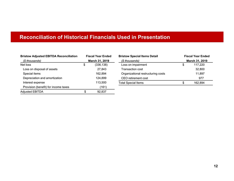 Reconciliation of Historical Financials Used in Presentation Bristow Adjusted EBITDA Reconciliation Fiscal Year Ended Bristow Special Items Detail Fiscal Year Ended ($ thousands) March 31, 2019 ($ thousands) March 31, 2019 Net loss $ (336,138) Loss on impairment $ 117,220 Loss on disposal of assets 27,843 Transaction cost 32,800 Special items 162,894 Organizational restructuring costs 11,897 Depreciation and amortization 124,899 CEO retirement cost 977 Interest expense 113,500 Total Special Items $ 162,894 Provision (benefit) for income taxes (161) Adjusted EBITDA $ 92,837 12Reconciliation of Historical Financials Used in Presentation Bristow Adjusted EBITDA Reconciliation Fiscal Year Ended Bristow Special Items Detail Fiscal Year Ended ($ thousands) March 31, 2019 ($ thousands) March 31, 2019 Net loss $ (336,138) Loss on impairment $ 117,220 Loss on disposal of assets 27,843 Transaction cost 32,800 Special items 162,894 Organizational restructuring costs 11,897 Depreciation and amortization 124,899 CEO retirement cost 977 Interest expense 113,500 Total Special Items $ 162,894 Provision (benefit) for income taxes (161) Adjusted EBITDA $ 92,837 12