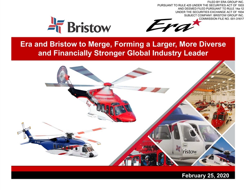 FILED BY ERA GROUP INC. PURSUANT TO RULE 425 UNDER THE SECURITIES ACT OF 1933 AND DEEMED FILED PURSUANT TO RULE 14a-12 UNDER THE SECURITIES EXCHANGE ACT OF 1934 SUBJECT COMPANY: BRISTOW GROUP INC. COMMISSION FILE NO. 001-31617 Era and Bristow to Merge, Forming a Larger, More Diverse and Financially Stronger Global Industry Leader February 25, 2020FILED BY ERA GROUP INC. PURSUANT TO RULE 425 UNDER THE SECURITIES ACT OF 1933 AND DEEMED FILED PURSUANT TO RULE 14a-12 UNDER THE SECURITIES EXCHANGE ACT OF 1934 SUBJECT COMPANY: BRISTOW GROUP INC. COMMISSION FILE NO. 001-31617 Era and Bristow to Merge, Forming a Larger, More Diverse and Financially Stronger Global Industry Leader February 25, 2020
