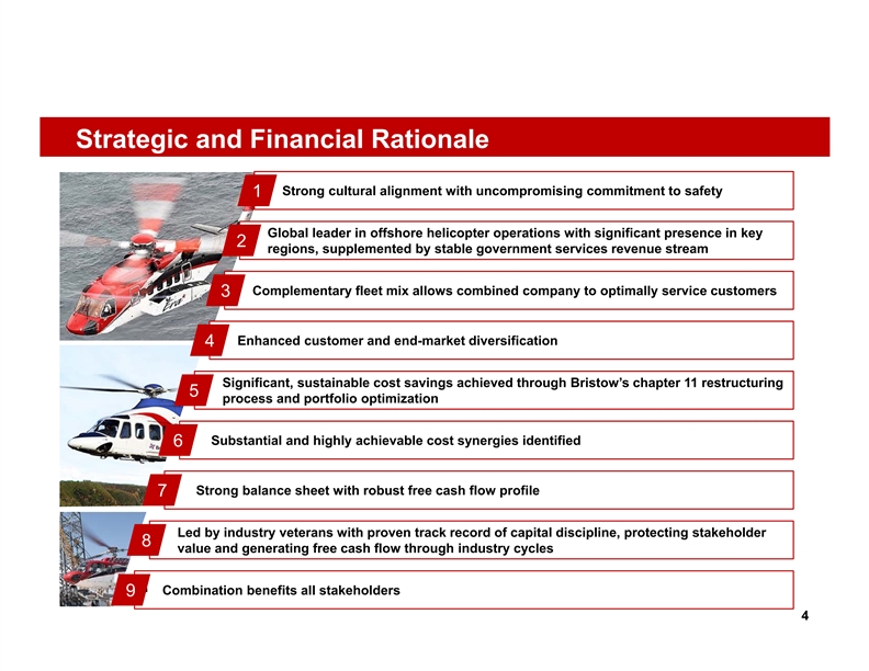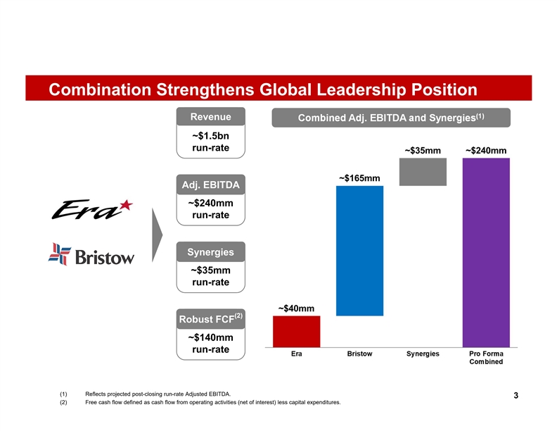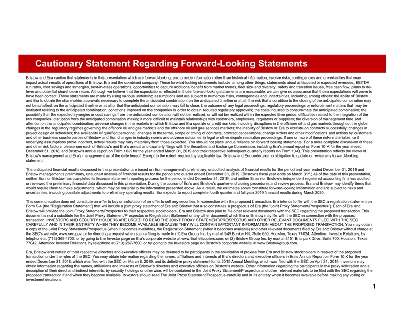 Cautionary Statement Regarding Forward-Looking Statements Bristow and Era caution that statements in this presentation which are forward-looking, and provide information other than historical information, involve risks, contingencies and uncertainties that may impact actual results of operations of Bristow, Era and the combined company. These forward-looking statements include, among other things, statements about anticipated or expected revenues, EBITDA run rates, cost savings and synergies, best-in-class operations, opportunities to capture additional benefit from market trends, fleet size and diversity, safety and transition issues, free cash flow, plans to de- lever and potential shareholder return. Although we believe that the expectations reflected in those forward-looking statements are reasonable, we can give no assurance that those expectations will prove to have been correct. Those statements are made by using various underlying assumptions and are subject to numerous risks, contingencies and uncertainties, including, among others: the ability of Bristow and Era to obtain the shareholder approvals necessary to complete the anticipated combination, on the anticipated timeline or at all; the risk that a condition to the closing of the anticipated combination may not be satisfied, on the anticipated timeline or at all or that the anticipated combination may fail to close; the outcome of any legal proceedings, regulatory proceedings or enforcement matters that may be instituted relating to the anticipated combination; conditions imposed on the companies in order to obtain required regulatory approvals; the costs incurred to consummate the anticipated combination; the possibility that the expected synergies or cost savings from the anticipated combination will not be realized, or will not be realized within the expected time period; difficulties related to the integration of the two companies; disruption from the anticipated combination making it more difficult to maintain relationships with customers, employees, regulators or suppliers; the diversion of management time and attention on the anticipated combination; adverse changes in the markets in which Bristow and Era operate or credit markets, including disruptions in the offshore oil and gas markets throughout the globe; changes in the regulatory regimes governing the offshore oil and gas markets and the offshore oil and gas services markets; the inability of Bristow or Era to execute on contracts successfully; changes in project design or schedules; the availability of qualified personnel, changes in the terms, scope or timing of contracts, contract cancellations, change orders and other modifications and actions by customers and other business counterparties of Bristow and Era, changes in industry norms and adverse outcomes in legal or other dispute resolution proceedings. If one or more of these risks materialize, or if underlying assumptions prove incorrect, actual results may vary materially from those expected. You should not place undue reliance on forward looking statements. For a more complete discussion of these and other risk factors, please see each of Bristow's and Era's annual and quarterly filings with the Securities and Exchange Commission, including Era's annual report on Form 10-K for the year ended December 31, 2018, and Bristow's annual report on Form 10-K for the year ended March 31, 2019 and their respective subsequent quarterly reports on Form 10-Q. This presentation reflects the views of Bristow's management and Era's management as of the date hereof. Except to the extent required by applicable law, Bristow and Era undertake no obligation to update or revise any forward-looking statement. The anticipated financial results discussed in this presentation are based on Era management's preliminary, unaudited analysis of financial results for the period and year ended December 31, 2019 and st Bristow management’s preliminary, unaudited analysis of financial results for the period and quarter ended December 31, 2019. (Bristow’s fiscal year ends on March 31 .) As of the date of this presentation, neither Era nor Bristow has completed its financial statement reporting process for the period ended December 31, 2019, and neither Era's nor Bristow’s independent registered accounting firm has audited or reviewed the preliminary financial data discussed in this presentation. During the course of Era's and Bristow’s quarter-end closing procedures and review process, Era and Bristow may identify items that would require them to make adjustments, which may be material to the information presented above. As a result, the estimates above constitute forward-looking information and are subject to risks and uncertainties, including possible adjustments to preliminary operating results. Era expects to report complete fourth quarter and full year 2019 financial results during March 2020. This communication does not constitute an offer to buy or solicitation of an offer to sell any securities. In connection with the proposed transaction, Era intends to file with the SEC a registration statement on Form S-4 (the “Registration Statement”) that will include a joint proxy statement of Era and Bristow that also constitutes a prospectus of Era (the “Joint Proxy Statement/Prospectus”). Each of Era and Bristow will provide the Joint Proxy Statement/Prospectus to their respective stockholders. Era and Bristow also plan to file other relevant documents with the SEC regarding the proposed transaction. This document is not a substitute for the Joint Proxy Statement/Prospectus or Registration Statement or any other document which Era or Bristow may file with the SEC in connection with the proposed transaction. INVESTORS AND SECURITY HOLDERS ARE URGED TO READ THE JOINT PROXY STATEMENT/PROSPECTUS AND OTHER RELEVANT DOCUMENTS FILED WITH THE SEC CAREFULLY AND IN THEIR ENTIRETY WHEN THEY BECOME AVAILABLE BECAUSE THEY WILL CONTAIN 