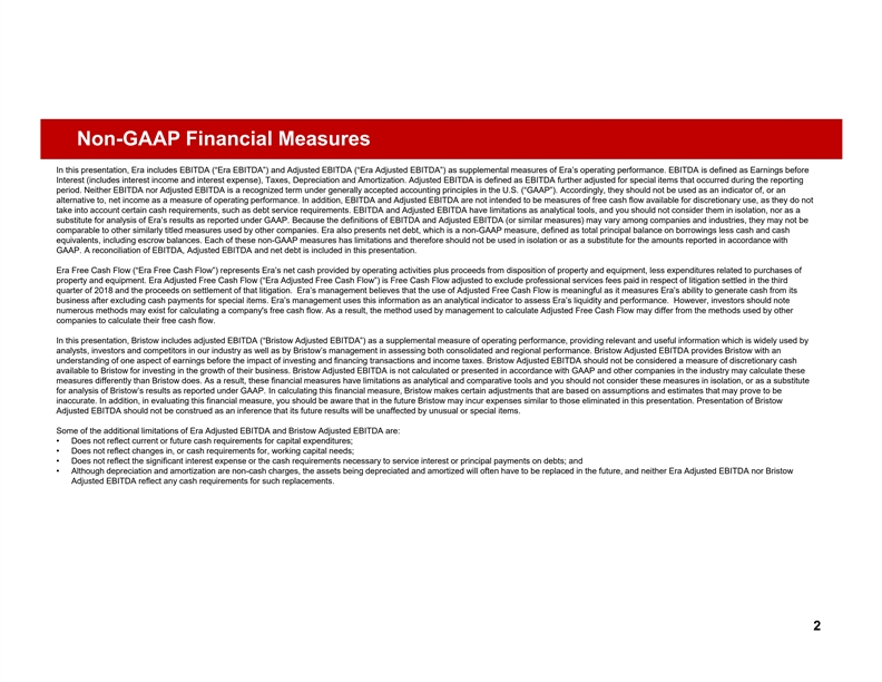 Non-GAAP Financial Measures In this presentation, Era includes EBITDA (“Era EBITDA”) and Adjusted EBITDA (“Era Adjusted EBITDA”) as supplemental measures of Era’s operating performance. EBITDA is defined as Earnings before Interest (includes interest income and interest expense), Taxes, Depreciation and Amortization. Adjusted EBITDA is defined as EBITDA further adjusted for special items that occurred during the reporting period. Neither EBITDA nor Adjusted EBITDA is a recognized term under generally accepted accounting principles in the U.S. (“GAAP”). Accordingly, they should not be used as an indicator of, or an alternative to, net income as a measure of operating performance. In addition, EBITDA and Adjusted EBITDA are not intended to be measures of free cash flow available for discretionary use, as they do not take into account certain cash requirements, such as debt service requirements. EBITDA and Adjusted EBITDA have limitations as analytical tools, and you should not consider them in isolation, nor as a substitute for analysis of Era’s results as reported under GAAP. Because the definitions of EBITDA and Adjusted EBITDA (or similar measures) may vary among companies and industries, they may not be comparable to other similarly titled measures used by other companies. Era also presents net debt, which is a non-GAAP measure, defined as total principal balance on borrowings less cash and cash equivalents, including escrow balances. Each of these non-GAAP measures has limitations and therefore should not be used in isolation or as a substitute for the amounts reported in accordance with GAAP. A reconciliation of EBITDA, Adjusted EBITDA and net debt is included in this presentation. Era Free Cash Flow (“Era Free Cash Flow”) represents Era’s net cash provided by operating activities plus proceeds from disposition of property and equipment, less expenditures related to purchases of property and equipment. Era Adjusted Free Cash Flow (“Era Adjusted Free Cash Flow”) is Free Cash Flow adjusted to exclude professional services fees paid in respect of litigation settled in the third quarter of 2018 and the proceeds on settlement of that litigation. Era’s management believes that the use of Adjusted Free Cash Flow is meaningful as it measures Era’s ability to generate cash from its business after excluding cash payments for special items. Era’s management uses this information as an analytical indicator to assess Era’s liquidity and performance. However, investors should note numerous methods may exist for calculating a company's free cash flow. As a result, the method used by management to calculate Adjusted Free Cash Flow may differ from the methods used by other companies to calculate their free cash flow. In this presentation, Bristow includes adjusted EBITDA (“Bristow Adjusted EBITDA”) as a supplemental measure of operating performance, providing relevant and useful information which is widely used by analysts, investors and competitors in our industry as well as by Bristow’s management in assessing both consolidated and regional performance. Bristow Adjusted EBITDA provides Bristow with an understanding of one aspect of earnings before the impact of investing and financing transactions and income taxes. Bristow Adjusted EBITDA should not be considered a measure of discretionary cash available to Bristow for investing in the growth of their business. Bristow Adjusted EBITDA is not calculated or presented in accordance with GAAP and other companies in the industry may calculate these measures differently than Bristow does. As a result, these financial measures have limitations as analytical and comparative tools and you should not consider these measures in isolation, or as a substitute for analysis of Bristow’s results as reported under GAAP. In calculating this financial measure, Bristow makes certain adjustments that are based on assumptions and estimates that may prove to be inaccurate. In addition, in evaluating this financial measure, you should be aware that in the future Bristow may incur expenses similar to those eliminated in this presentation. Presentation of Bristow Adjusted EBITDA should not be construed as an inference that its future results will be unaffected by unusual or special items. Some of the additional limitations of Era Adjusted EBITDA and Bristow Adjusted EBITDA are: • Does not reflect current or future cash requirements for capital expenditures; • Does not reflect changes in, or cash requirements for, working capital needs; • Does not reflect the significant interest expense or the cash requirements necessary to service interest or principal payments on debts; and • Although depreciation and amortization are non-cash charges, the assets being depreciated and amortized will often have to be replaced in the future, and neither Era Adjusted EBITDA nor Bristow Adjusted EBITDA reflect any cash requirements for such replacements. 2Non-GAAP Financial Measures In this presentation, Era includes EBITDA (“Era EBITDA”) and Adjusted EBITDA (“Era Adjusted EBITDA”) as supplemental measures of Era’s operating performance. EBITDA is defined as Earnings before Interest (includes interest income and interest expense), Taxes, Depreciation and Amortization. Adjusted EBITDA is defined as EBITDA further adjusted for special items that occurred during the reporting period. Neither EBITDA nor Adjusted EBITDA is a recognized term under generally accepted accounting principles in the U.S. (“GAAP”). Accordingly, they should not be used as an indicator of, or an alternative to, net income as a measure of operating performance. In addition, EBITDA and Adjusted EBITDA are not intended to be measures of free cash flow available for discretionary use, as they do not take into account certain cash requirements, such as debt service requirements. EBITDA and Adjusted EBITDA have limitations as analytical tools, and you should not con