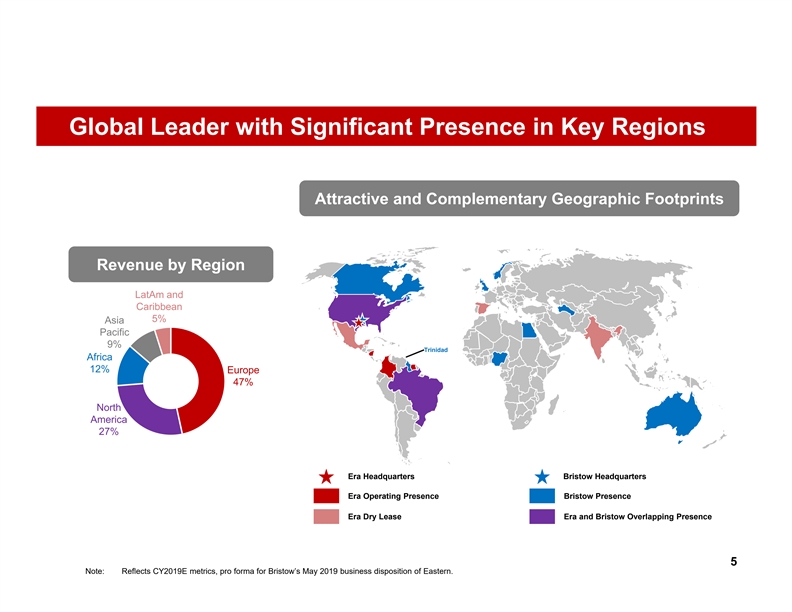 Strategic and Financial Rationale § Strong cultural alignment with uncompromising commitment to safety 1 1 § Global leader in offshore helicopter operations with significant presence in key 2 2 regions, supplemented by stable government services revenue stream § Complementary fleet mix allows combined company to optimally service customers 3 3 § Enhanced customer and end-market diversification 4 4 § Significant, sustainable cost savings achieved through Bristow’s chapter 11 restructuring 5 5 process and portfolio optimization § Substantial and highly achievable cost synergies identified 6 6 § Strong balance sheet with robust free cash flow profile 7 7 § Led by industry veterans with proven track record of capital discipline, protecting stakeholder 8 8 value and generating free cash flow through industry cycles § Combination benefits all stakeholders 9 9 4Strategic and Financial Rationale § Strong cultural alignment with uncompromising commitment to safety 1 1 § Global leader in offshore helicopter operations with significant presence in key 2 2 regions, supplemented by stable government services revenue stream § Complementary fleet mix allows combined company to optimally service customers 3 3 § Enhanced customer and end-market diversification 4 4 § Significant, sustainable cost savings achieved through Bristow’s chapter 11 restructuring 5 5 process and portfolio optimization § Substantial and highly achievable cost synergies identified 6 6 § Strong balance sheet with robust free cash flow profile 7 7 § Led by industry veterans with proven track record of capital discipline, protecting stakeholder 8 8 value and generating free cash flow through industry cycles § Combination benefits all stakeholders 9 9 4
