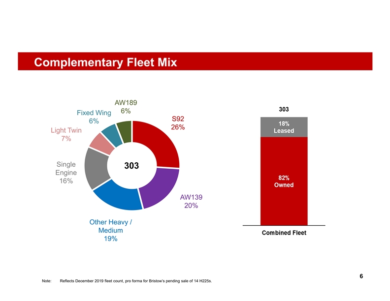 Global Leader with Significant Presence in Key Regions Attractive and Complementary Geographic Footprints Revenue by Region LatAm and Caribbean 5% Asia Pacific 9% Trinidad Africa 12% Europe 47% North America 27% Era Headquarters Bristow Headquarters Era Operating Presence Bristow Presence Era Dry Lease Era and Bristow Overlapping Presence 5 Note: Reflects CY2019E metrics, pro forma for Bristow’s May 2019 business disposition of Eastern.Global Leader with Significant Presence in Key Regions Attractive and Complementary Geographic Footprints Revenue by Region LatAm and Caribbean 5% Asia Pacific 9% Trinidad Africa 12% Europe 47% North America 27% Era Headquarters Bristow Headquarters Era Operating Presence Bristow Presence Era Dry Lease Era and Bristow Overlapping Presence 5 Note: Reflects CY2019E metrics, pro forma for Bristow’s May 2019 business disposition of Eastern.