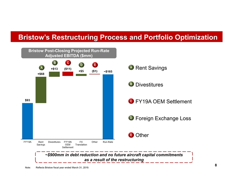 Enhanced Customer and End-Market Diversification (1) Revenue by End Market Government Services Revenue UK SAR and BSEE contracts Other provide meaningful diversification Fixed Wing 2% 5% from oil price volatility Government Services Flight Hours, 18% 15% UK SAR Oil & Revenue Gas Monthly 75% Structure Standing Charge (MSC), 85% Attractive mix of oil and gas customers with long-term relationships, and diversified end-market exposure with significant government services revenue 7 (1) Reflects CY2019E metrics, pro forma for Bristow’s May 2019 business disposition of Eastern. Government Services includes UK SAR and BSEE contracts.Enhanced Customer and End-Market Diversification (1) Revenue by End Market Government Services Revenue UK SAR and BSEE contracts Other provide meaningful diversification Fixed Wing 2% 5% from oil price volatility Government Services Flight Hours, 18% 15% UK SAR Oil & Revenue Gas Monthly 75% Structure Standing Charge (MSC), 85% Attractive mix of oil and gas customers with long-term relationships, and diversified end-market exposure with significant government services revenue 7 (1) Reflects CY2019E metrics, pro forma for Bristow’s May 2019 business disposition of Eastern. Government Services includes UK SAR and BSEE contracts.