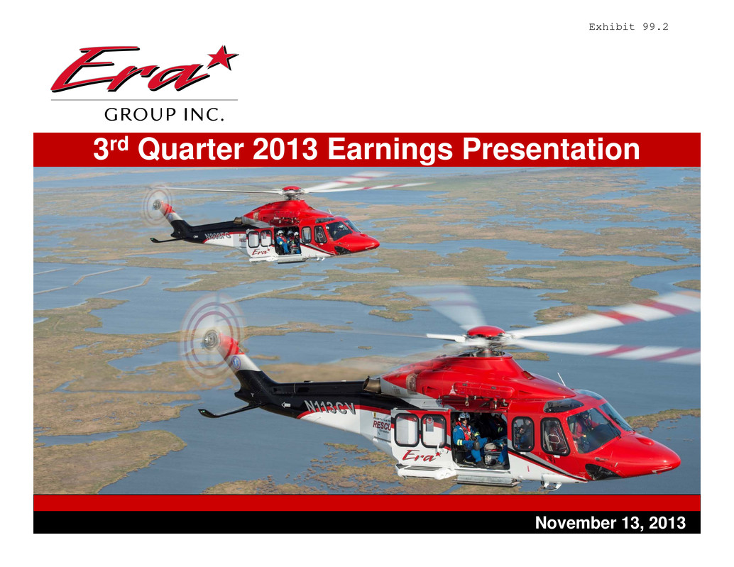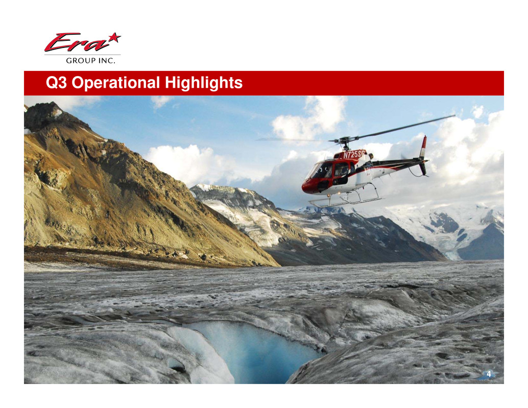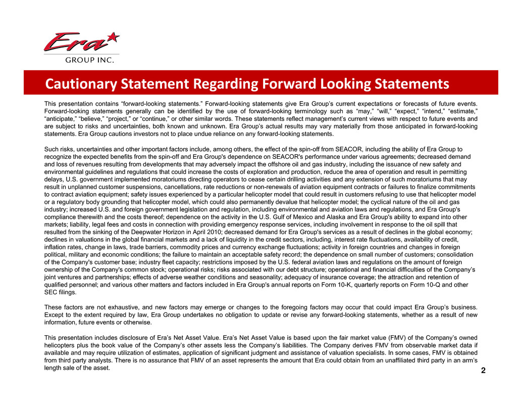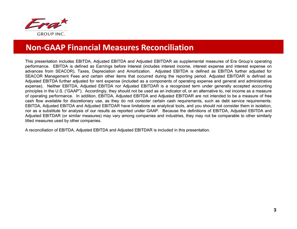 2 This presentation contains “forward-looking statements.” Forward-looking statements give Era Group’s current expectations or forecasts of future events. Forward-looking statements generally can be identified by the use of forward-looking terminology such as “may,” “will,” “expect,” “intend,” “estimate,” “anticipate,” “believe,” “project,” or “continue,” or other similar words. These statements reflect management’s current views with respect to future events and are subject to risks and uncertainties, both known and unknown. Era Group’s actual results may vary materially from those anticipated in forward-looking statements. Era Group cautions investors not to place undue reliance on any forward-looking statements. Such risks, uncertainties and other important factors include, among others, the effect of the spin-off from SEACOR, including the ability of Era Group to recognize the expected benefits from the spin-off and Era Group's dependence on SEACOR's performance under various agreements; decreased demand and loss of revenues resulting from developments that may adversely impact the offshore oil and gas industry, including the issuance of new safety and environmental guidelines and regulations that could increase the costs of exploration and production, reduce the area of operation and result in permitting delays, U.S. government implemented moratoriums directing operators to cease certain drilling activities and any extension of such moratoriums that may result in unplanned customer suspensions, cancellations, rate reductions or non-renewals of aviation equipment contracts or failures to finalize commitments to contract aviation equipment; safety issues experienced by a particular helicopter model that could result in customers refusing to use that helicopter model or a regulatory body grounding that helicopter model, which could also permanently devalue that helicopter model; the cyclical nature of the oil and gas industry; increased U.S. and foreign government legislation and regulation, including environmental and aviation laws and regulations, and Era Group's compliance therewith and the costs thereof; dependence on the activity in the U.S. Gulf of Mexico and Alaska and Era Group's ability to expand into other markets; liability, legal fees and costs in connection with providing emergency response services, including involvement in response to the oil spill that resulted from the sinking of the Deepwater Horizon in April 2010; decreased demand for Era Group's services as a result of declines in the global economy; declines in valuations in the global financial markets and a lack of liquidity in the credit sectors, including, interest rate fluctuations, availability of credit, inflation rates, change in laws, trade barriers, commodity prices and currency exchange fluctuations; activity in foreign countries and changes in foreign political, military and economic conditions; the failure to maintain an acceptable safety record; the dependence on small number of customers; consolidation of the Company's customer base; industry fleet capacity; restrictions imposed by the U.S. federal aviation laws and regulations on the amount of foreign ownership of the Company's common stock; operational risks; risks associated with our debt structure; operational and financial difficulties of the Company’s joint ventures and partnerships; effects of adverse weather conditions and seasonality; adequacy of insurance coverage; the attraction and retention of qualified personnel; and various other matters and factors included in Era Group's annual reports on Form 10-K, quarterly reports on Form 10-Q and other SEC filings. These factors are not exhaustive, and new factors may emerge or changes to the foregoing factors may occur that could impact Era Group’s business. Except to the extent required by law, Era Group undertakes no obligation to update or revise any forward-looking statements, whether as a result of new information, future events or otherwise. This presentation includes disclosure of Era’s Net Asset Value. Era’s Net Asset Value is based upon the fair market value (FMV) of the Company’s owned helicopters plus the book value of the Company’s other assets less the Company’s liabilities. The Company derives FMV from observable market data if available and may require utilization of estimates, application of significant judgment and assistance of valuation specialists. In some cases, FMV is obtained from third party analysts. There is no assurance that FMV of an asset represents the amount that Era could obtain from an unaffiliated third party in an arm’s length sale of the asset. Cautionary Statement Regarding Forward Looking Statements