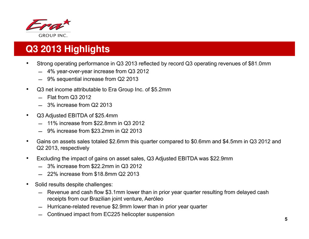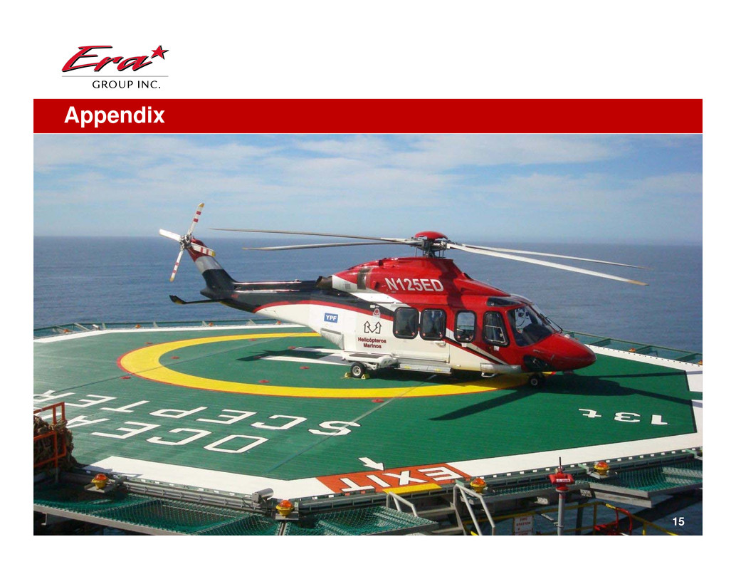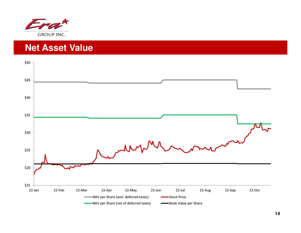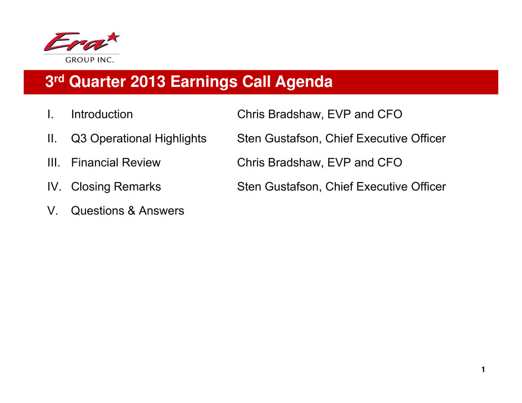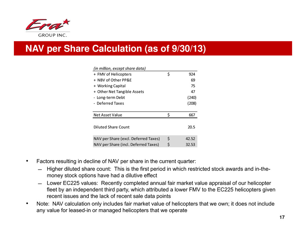 2 This presentation contains “forward-looking statements.” Forward-looking statements give Era Group’s current expectations or forecasts of future events. Forward-looking statements generally can be identified by the use of forward-looking terminology such as “may,” “will,” “expect,” “intend,” “estimate,” “anticipate,” “believe,” “project,” or “continue,” or other similar words. These statements reflect management’s current views with respect to future events and are subject to risks and uncertainties, both known and unknown. Era Group’s actual results may vary materially from those anticipated in forward-looking statements. Era Group cautions investors not to place undue reliance on any forward-looking statements. Such risks, uncertainties and other important factors include, among others, the effect of the spin-off from SEACOR, including the ability of Era Group to recognize the expected benefits from the spin-off and Era Group's dependence on SEACOR's performance under various agreements; decreased demand and loss of revenues resulting from developments that may adversely impact the offshore oil and gas industry, including the issuance of new safety and environmental guidelines and regulations that could increase the costs of exploration and production, reduce the area of operation and result in permitting delays, U.S. government implemented moratoriums directing operators to cease certain drilling activities and any extension of such moratoriums that may result in unplanned customer suspensions, cancellations, rate reductions or non-renewals of aviation equipment contracts or failures to finalize commitments to contract aviation equipment; safety issues experienced by a particular helicopter model that could result in customers refusing to use that helicopter model or a regulatory body grounding that helicopter model, which could also permanently devalue that helicopter model; the cyclical nature of the oil and gas industry; increased U.S. and foreign government legislation and regulation, including environmental and aviation laws and regulations, and Era Group's compliance therewith and the costs thereof; dependence on the activity in the U.S. Gulf of Mexico and Alaska and Era Group's ability to expand into other markets; liability, legal fees and costs in connection with providing emergency response services, including involvement in response to the oil spill that resulted from the sinking of the Deepwater Horizon in April 2010; decreased demand for Era Group's services as a result of declines in the global economy; declines in valuations in the global financial markets and a lack of liquidity in the credit sectors, including, interest rate fluctuations, availability of credit, inflation rates, change in laws, trade barriers, commodity prices and currency exchange fluctuations; activity in foreign countries and changes in foreign political, military and economic conditions; the failure to maintain an acceptable safety record; the dependence on small number of customers; consolidation of the Company's customer base; industry fleet capacity; restrictions imposed by the U.S. federal aviation laws and regulations on the amount of foreign ownership of the Company's common stock; operational risks; risks associated with our debt structure; operational and financial difficulties of the Company’s joint ventures and partnerships; effects of adverse weather conditions and seasonality; adequacy of insurance coverage; the attraction and retention of qualified personnel; and various other matters and factors included in Era Group's annual reports on Form 10-K, quarterly reports on Form 10-Q and other SEC filings. These factors are not exhaustive, and new factors may emerge or changes to the foregoing factors may occur that could impact Era Group’s business. Except to the extent required by law, Era Group undertakes no obligation to update or revise any forward-looking statements, whether as a result of new information, future events or otherwise. This presentation includes disclosure of Era’s Net Asset Value. Era’s Net Asset Value is based upon the fair market value (FMV) of the Company’s owned helicopters plus the book value of the Company’s other assets less the Company’s liabilities. The Company derives FMV from observable market data if available and may require utilization of estimates, application of significant judgment and assistance of valuation specialists. In some cases, FMV is obtained from third party analysts. There is no assurance that FMV of an asset represents the amount that Era could obtain from an unaffiliated third party in an arm’s length sale of the asset. Cautionary Statement Regarding Forward Looking Statements