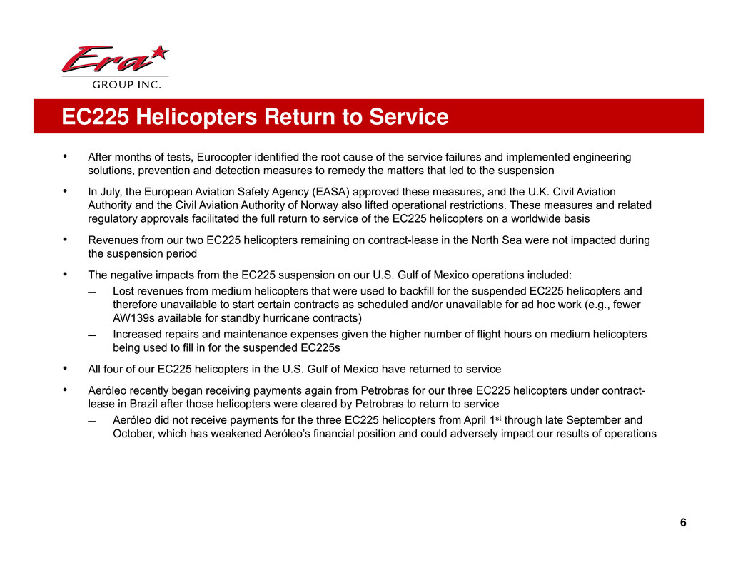5 Q3 2013 Highlights • Strong operating performance in Q3 2013 reflected by record Q3 operating revenues of $81.0mm ̶ 4% year-over-year increase from Q3 2012 ̶ 9% sequential increase from Q2 2013 • Q3 net income attributable to Era Group Inc. of $5.2mm ̶ Flat from Q3 2012 ̶ 3% increase from Q2 2013 • Q3 Adjusted EBITDA of $25.4mm ̶ 11% increase from $22.8mm in Q3 2012 ̶ 9% increase from $23.2mm in Q2 2013 • Gains on assets sales totaled $2.6mm this quarter compared to $0.6mm and $4.5mm in Q3 2012 and Q2 2013, respectively • Excluding the impact of gains on asset sales, Q3 Adjusted EBITDA was $22.9mm ̶ 3% increase from $22.2mm in Q3 2012 ̶ 22% increase from $18.8mm Q2 2013 • Solid results despite challenges: ̶ Revenue and cash flow $3.1mm lower than in prior year quarter resulting from delayed cash receipts from our Brazilian joint venture, Aeróleo ̶ Hurricane-related revenue $2.9mm lower than in prior year quarter ̶ Continued impact from EC225 helicopter suspension