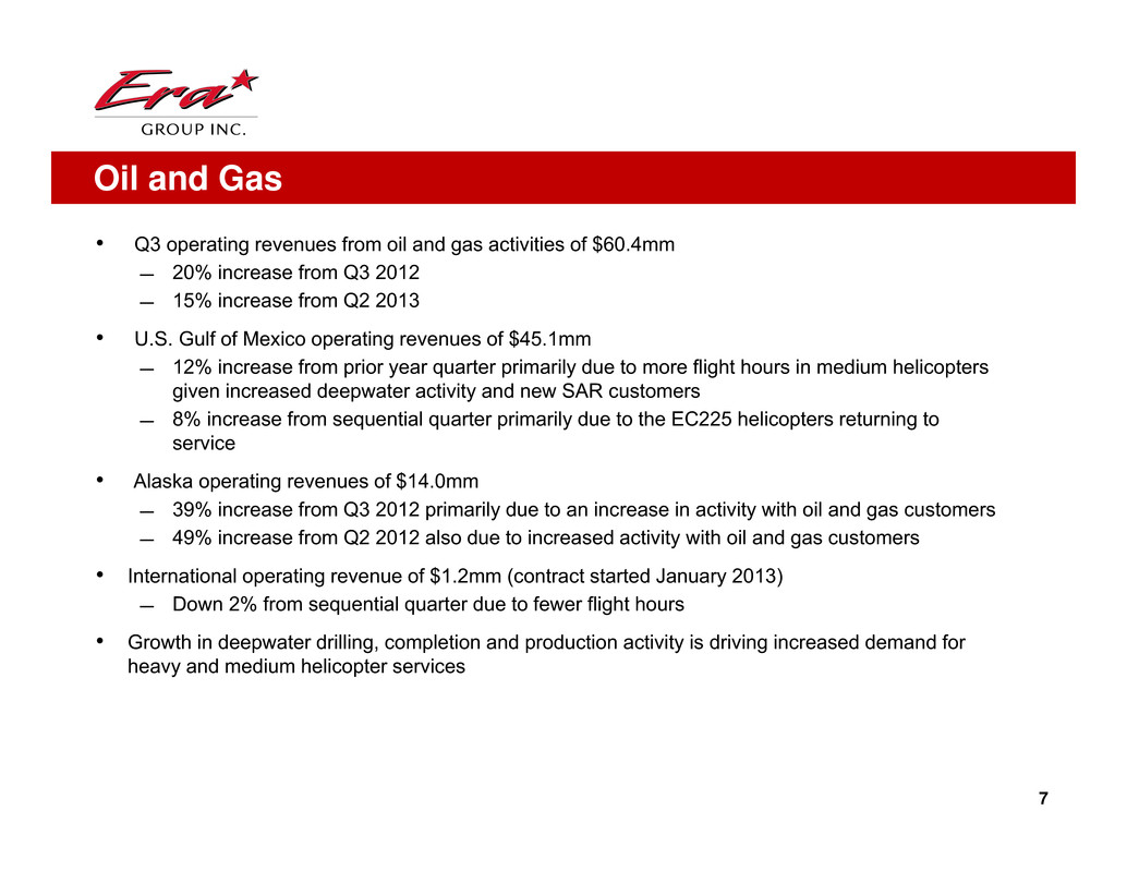 EC225 Helicopters Return to Service 6 • After months of tests, Eurocopter identified the root cause of the service failures and implemented engineering solutions, prevention and detection measures to remedy the matters that led to the suspension • In July, the European Aviation Safety Agency (EASA) approved these measures, and the U.K. Civil Aviation Authority and the Civil Aviation Authority of Norway also lifted operational restrictions. These measures and related regulatory approvals facilitated the full return to service of the EC225 helicopters on a worldwide basis • Revenues from our two EC225 helicopters remaining on contract-lease in the North Sea were not impacted during the suspension period • The negative impacts from the EC225 suspension on our U.S. Gulf of Mexico operations included: ̶ Lost revenues from medium helicopters that were used to backfill for the suspended EC225 helicopters and therefore unavailable to start certain contracts as scheduled and/or unavailable for ad hoc work (e.g., fewer AW139s available for standby hurricane contracts) ̶ Increased repairs and maintenance expenses given the higher number of flight hours on medium helicopters being used to fill in for the suspended EC225s • All four of our EC225 helicopters in the U.S. Gulf of Mexico have returned to service • Aeróleo recently began receiving payments again from Petrobras for our three EC225 helicopters under contract- lease in Brazil after those helicopters were cleared by Petrobras to return to service ̶ Aeróleo did not receive payments for the three EC225 helicopters from April 1st through late September and October, which has weakened Aeróleo’s financial position and could adversely impact our results of operations