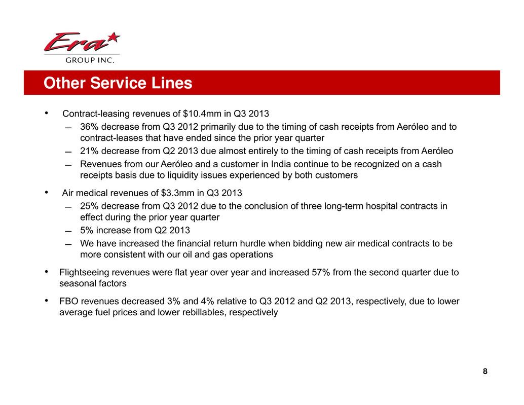 7 Oil and Gas • Q3 operating revenues from oil and gas activities of $60.4mm ̶ 20% increase from Q3 2012 ̶ 15% increase from Q2 2013 • U.S. Gulf of Mexico operating revenues of $45.1mm ̶ 12% increase from prior year quarter primarily due to more flight hours in medium helicopters given increased deepwater activity and new SAR customers ̶ 8% increase from sequential quarter primarily due to the EC225 helicopters returning to service • Alaska operating revenues of $14.0mm ̶ 39% increase from Q3 2012 primarily due to an increase in activity with oil and gas customers ̶ 49% increase from Q2 2012 also due to increased activity with oil and gas customers • International operating revenue of $1.2mm (contract started January 2013) ̶ Down 2% from sequential quarter due to fewer flight hours • Growth in deepwater drilling, completion and production activity is driving increased demand for heavy and medium helicopter services