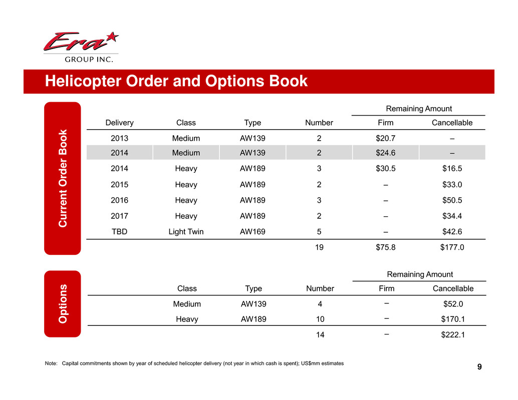 8 Other Service Lines • Contract-leasing revenues of $10.4mm in Q3 2013 ̶ 36% decrease from Q3 2012 primarily due to the timing of cash receipts from Aeróleo and to contract-leases that have ended since the prior year quarter ̶ 21% decrease from Q2 2013 due almost entirely to the timing of cash receipts from Aeróleo ̶ Revenues from our Aeróleo and a customer in India continue to be recognized on a cash receipts basis due to liquidity issues experienced by both customers • Air medical revenues of $3.3mm in Q3 2013 ̶ 25% decrease from Q3 2012 due to the conclusion of three long-term hospital contracts in effect during the prior year quarter ̶ 5% increase from Q2 2013 ̶ We have increased the financial return hurdle when bidding new air medical contracts to be more consistent with our oil and gas operations • Flightseeing revenues were flat year over year and increased 57% from the second quarter due to seasonal factors • FBO revenues decreased 3% and 4% relative to Q3 2012 and Q2 2013, respectively, due to lower average fuel prices and lower rebillables, respectively
