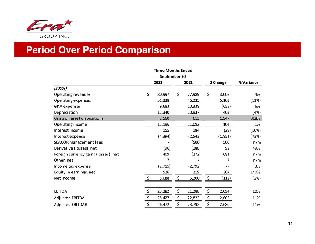 12 Sequential Quarter Comparison Three Months Ended 30‐Sep 30‐Jun $ Change % Variance ($000s) Operating revenues 80,997$ 74,237$ 6,760$ 9% Operating expenses 51,338 46,945 4,393 (9%) G&A expenses 9,683 9,545 138 (1%) Depreciation 11,340 11,431 (91) 1% Gains on asset dispositions 2,560 4,476 (1,916) (43%) Operating income 11,196 10,792 404 4% Interest income 155 150 5 3% Interest expense (4,394) (4,613) 219 5% SEACOR management fees ‐ ‐ ‐ n/m Derivative gains (losses), net (96) 21 (117) n/m Foreign currency gains, net 409 315 94 30% Other, net 7 9 (2) (22%) Income tax expense (2,715) (2,398) (317) (13%) Equity in earnings, net 526 674 (148) (22%) Net income 5,088$ 4,950$ 138$ 3% EBITDA 23,382$ 23,242$ 140$ 1% Adjusted EBITDA 25,427$ 23,242$ 2,185$ 9% Adjusted EBITDAR 26,472$ 24,161$ 2,311$ 10%