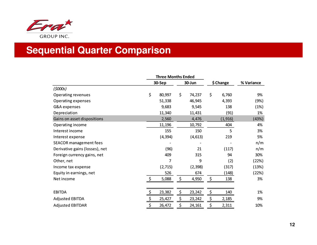 11 Period Over Period Comparison Three Months Ended September 30, 2013 2012 $ Change % Variance ($000s) Operating revenues 80,997$ 77,989$ 3,008$ 4% Operating expenses 51,338 46,235 5,103 (11%) G&A expenses 9,683 10,338 (655) 6% Depreciation 11,340 10,937 403 (4%) Gains on asset dispositions 2,560 613 1,947 318% Operating income 11,196 11,092 104 1% Interest income 155 184 (29) (16%) Interest expense (4,394) (2,543) (1,851) (73%) SEACOR management fees ‐ (500) 500 n/m Derivative (losses), net (96) (188) 92 49% Foreign currency gains (losses), net 409 (272) 681 n/m Other, net 7 ‐ 7 n/m Income tax expense (2,715) (2,792) 77 3% Equity in earnings, net 526 219 307 140% Net income 5,088$ 5,200$ (112)$ (2%) EBITDA 23,382$ 21,288$ 2,094$ 10% Adjusted EBITDA 25,427$ 22,822$ 2,605$ 11% Adjusted EBITDAR 26,472$ 23,792$ 2,680$ 11%
