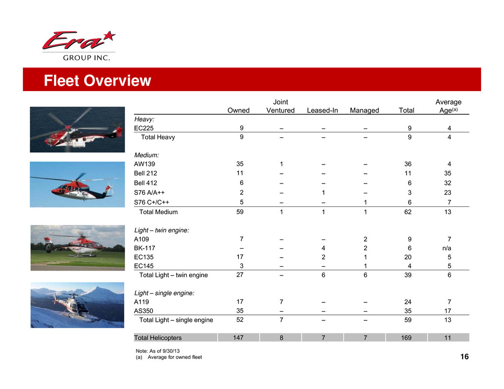 Owned Joint Ventured Leased-In Managed Total Average Age(a) Heavy: EC225 9 – – – 9 4 Total Heavy 9 – – – 9 4 Medium: AW139 35 1 – – 36 4 Bell 212 11 – – – 11 35 Bell 412 6 – – – 6 32 S76 A/A++ 2 – 1 – 3 23 S76 C+/C++ 5 – – 1 6 7 Total Medium 59 1 1 1 62 13 Light – twin engine: A109 7 – – 2 9 7 BK-117 – – 4 2 6 n/a EC135 17 – 2 1 20 5 EC145 3 – – 1 4 5 Total Light – twin engine 27 – 6 6 39 6 Light – single engine: A119 17 7 – – 24 7 AS350 35 – – – 35 17 Total Light – single engine 52 7 – – 59 13 Total Helicopters 147 8 7 7 169 11 Note: As of 9/30/13 (a) Average for owned fleet Fleet Overview 16