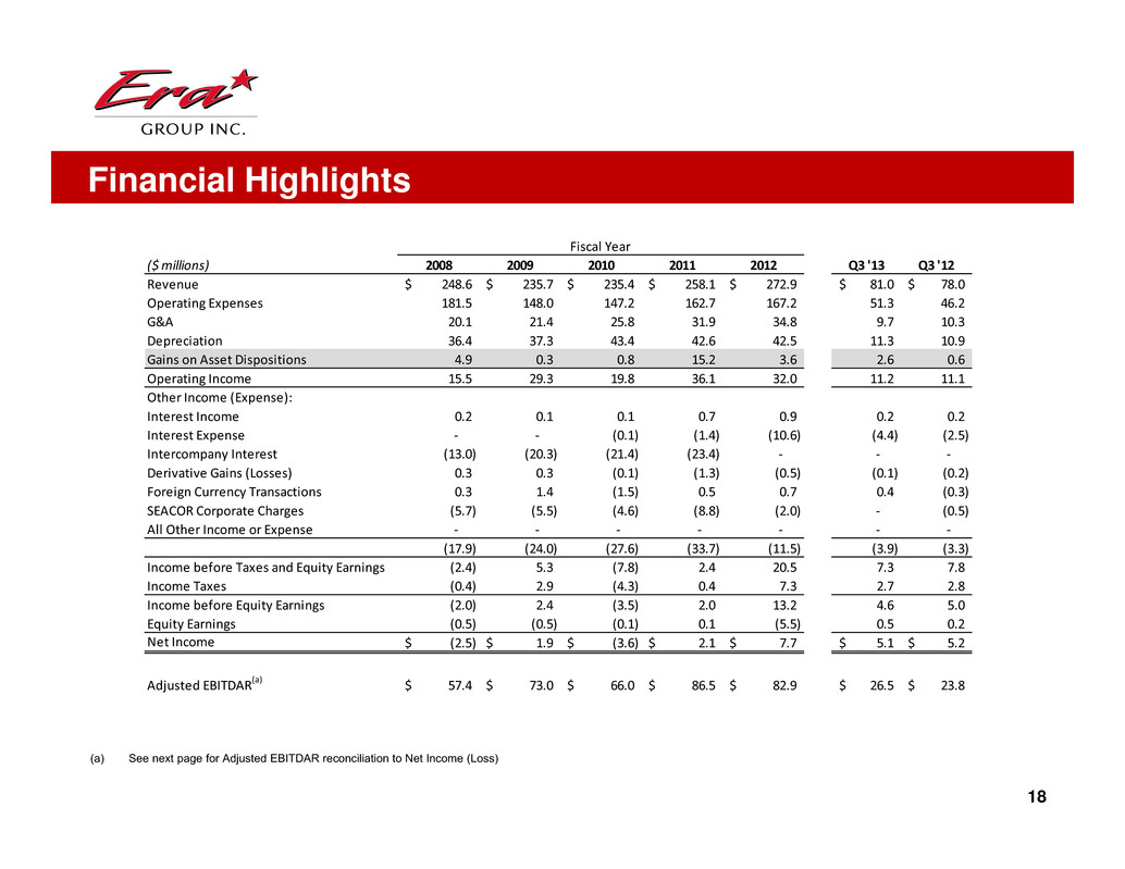 17 NAV per Share Calculation (as of 9/30/13) • Factors resulting in decline of NAV per share in the current quarter: ̶ Higher diluted share count: This is the first period in which restricted stock awards and in-the- money stock options have had a dilutive effect ̶ Lower EC225 values: Recently completed annual fair market value appraisal of our helicopter fleet by an independent third party, which attributed a lower FMV to the EC225 helicopters given recent issues and the lack of recent sale data points • Note: NAV calculation only includes fair market value of helicopters that we own; it does not include any value for leased-in or managed helicopters that we operate (in million, except share data) + FMV of Helicopters 924$ + NBV of Other PP&E 69 + Working Capital 75 + Other Net Tangible Assets 47 ‐ Long‐term Debt (240) ‐ Deferred Taxes (208) Net Asset Value 667$ Diluted Share Count 20.5 NAV per Share (excl. Deferred Taxes) 42.52$ NAV per Share (incl. Deferred Taxes) 32.53$