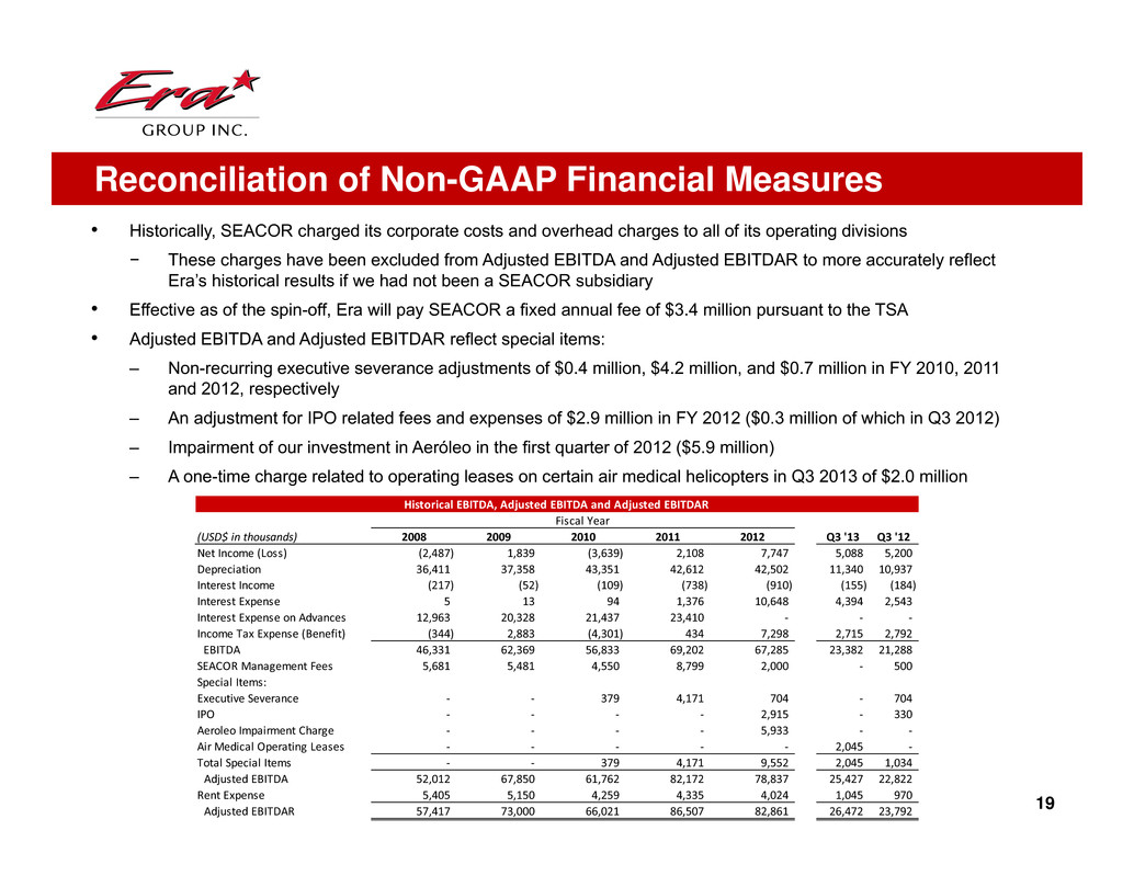 Reconciliation of Non-GAAP Financial Measures • Historically, SEACOR charged its corporate costs and overhead charges to all of its operating divisions − These charges have been excluded from Adjusted EBITDA and Adjusted EBITDAR to more accurately reflect Era’s historical results if we had not been a SEACOR subsidiary • Effective as of the spin-off, Era will pay SEACOR a fixed annual fee of $3.4 million pursuant to the TSA • Adjusted EBITDA and Adjusted EBITDAR reflect special items: – Non-recurring executive severance adjustments of $0.4 million, $4.2 million, and $0.7 million in FY 2010, 2011 and 2012, respectively – An adjustment for IPO related fees and expenses of $2.9 million in FY 2012 ($0.3 million of which in Q3 2012) – Impairment of our investment in Aeróleo in the first quarter of 2012 ($5.9 million) – A one-time charge related to operating leases on certain air medical helicopters in Q3 2013 of $2.0 million 19 (USD$ in thousands) 2008 2009 2010 2011 2012 Q3 '13 Q3 '12 Net Income (Loss) (2,487) 1,839 (3,639) 2,108 7,747 5,088 5,200 Depreciation 36,411 37,358 43,351 42,612 42,502 11,340 10,937 Interest Income (217) (52) (109) (738) (910) (155) (184) Interest Expense 5 13 94 1,376 10,648 4,394 2,543 Interest Expense on Advances 12,963 20,328 21,437 23,410 ‐ ‐ ‐ Income Tax Expense (Benefit) (344) 2,883 (4,301) 434 7,298 2,715 2,792 EBITDA 46,331 62,369 56,833 69,202 67,285 23,382 21,288 SEACOR Management Fees 5,681 5,481 4,550 8,799 2,000 ‐ 500 Special Items: Executive Severance ‐ ‐ 379 4,171 704 ‐ 704 IPO ‐ ‐ ‐ ‐ 2,915 ‐ 330 Aeroleo Impairment Charge ‐ ‐ ‐ ‐ 5,933 ‐ ‐ Air Medical Operating Leases ‐ ‐ ‐ ‐ ‐ 2,045 ‐ Total Special Items ‐ ‐ 379 4,171 9,552 2,045 1,034 Adjusted EBITDA 52,012 67,850 61,762 82,172 78,837 25,427 22,822 Rent Expense 5,405 5,150 4,259 4,335 4,024 1,045 970 Adjusted EBITDAR 57,417 73,000 66,021 86,507 82,861 26,472 23,792 Fiscal Year Historical EBITDA, Adjusted EBITDA and Adjusted EBITDAR