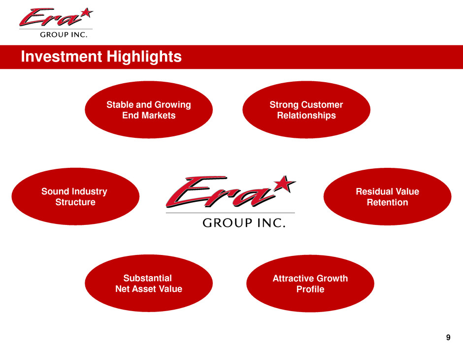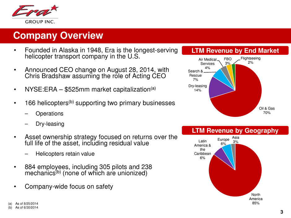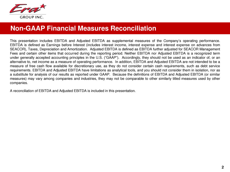 1 This presentation contains “forward-looking statements.” Forward-looking statements give the Company’s current expectations or forecasts of future events. Forward-looking statements generally can be identified by the use of forward-looking terminology such as “may,” “will,” “expect,” “intend,” “estimate,” “anticipate,” “believe,” “project,” or “continue,” or other similar words. These statements reflect management’s current views with respect to future events and are subject to risks and uncertainties, both known and unknown. The Company’s actual results may vary materially from those anticipated in forward-looking statements. The Company cautions investors not to place undue reliance on any forward-looking statements. Such risks, uncertainties and other important factors include, among others, the Company’s dependence on, and the cyclical nature of, the offshore oil and gas industry; the Company’s dependence on oil and gas exploration and development activity in the areas where the Company operates; fluctuations in worldwide prices of and demand for oil and natural gas; the ability to successfully expand into other geographic and helicopter service markets; the impact of increased U.S. and foreign government regulation and legislation, including potential government implemented moratoriums on drilling activities; the requirement to engage in competitive processes or expend significant resources with no guaranty of recoupment; inherent risks in operating helicopters; the failure to maintain an acceptable safety record; the grounding of all or a portion of our fleet for extended periods of time or indefinitely; reduction or cancellation of services for government agencies; reliance on a small number of helicopter manufacturers and suppliers; political instability, governmental action, war, acts of terrorism and changes in the economic condition in any foreign country where the Company does business, which may result in expropriation, nationalization, confiscation or deprivation of our assets or result in claims of a force majeure situation; declines in the global economy and financial markets; foreign currency exposure and exchange controls; credit risk exposure; the ongoing need to replace aging helicopters; the Company’s reliance on the secondary used helicopter market to dispose of older helicopters; the Company’s reliance on a small number of customers; allocation of risk between the Company and its customers; liability, legal fees and costs in connection with providing emergency response services; risks associated with the Company’s debt structure; operational and financial difficulties of the Company’s joint ventures and partners; conflict with the other owners of the Company’s non-wholly owned subsidiaries and other equity investees; adverse results of legal proceedings; adverse weather conditions and seasonality; adequacy of insurance coverage; the attraction and retention of qualified personnel; restrictions on the amount of foreign ownership of the Company’s common stock; the effect of the Spin-off, including the ability of the Company to recognize the expected benefits from the Spin-off and the Company’s dependence on SEACOR’s performance under various agreements; and various other matters and factors included in the Company’s annual reports on Form 10-K, quarterly reports on Form 10-Q and other SEC filings. These factors are not exhaustive, and new factors may emerge or changes to the foregoing factors may occur that could impact the Company’s business. Except to the extent required by law, the Company undertakes no obligation to update or revise any forward-looking statements, whether as a result of new information, future events or otherwise. This presentation includes disclosure of the Company’s Net Asset Value. The Company’s Net Asset Value is based upon the fair market value (FMV) of the Company’s owned helicopters plus the book value of the Company’s other assets less the Company’s liabilities. The Company derives FMV from observable market data if available and may require utilization of estimates, application of significant judgment and assistance of valuation specialists. In some cases, FMV is obtained from third party analysts. There is no assurance that FMV of an asset represents the amount that Era could obtain from an unaffiliated third party in an arm’s length sale of the asset. Cautionary Statement Regarding Forward Looking Statements