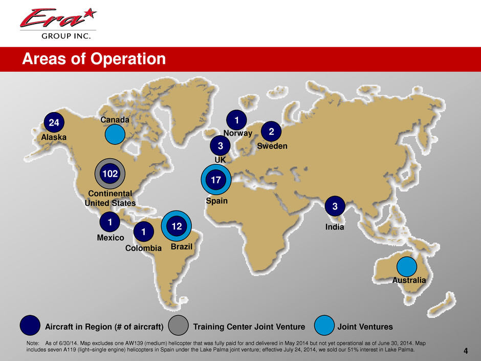 Areas of Operation Australia Continental United States Sweden Aircraft in Region (# of aircraft) Spain Canada India Mexico 1 UK 3 Norway Brazil Training Center Joint Venture 17 2 1 102 3 Joint Ventures Australia 12 24 Alaska 4 1 Colombia Note: As of 6/30/14. Map excludes one AW139 (medium) helicopter that was fully paid for and delivered in May 2014 but not yet operational as of June 30, 2014. Map includes seven A119 (light–single engine) helicopters in Spain under the Lake Palma joint venture; effective July 24, 2014, we sold our 51% interest in Lake Palma.