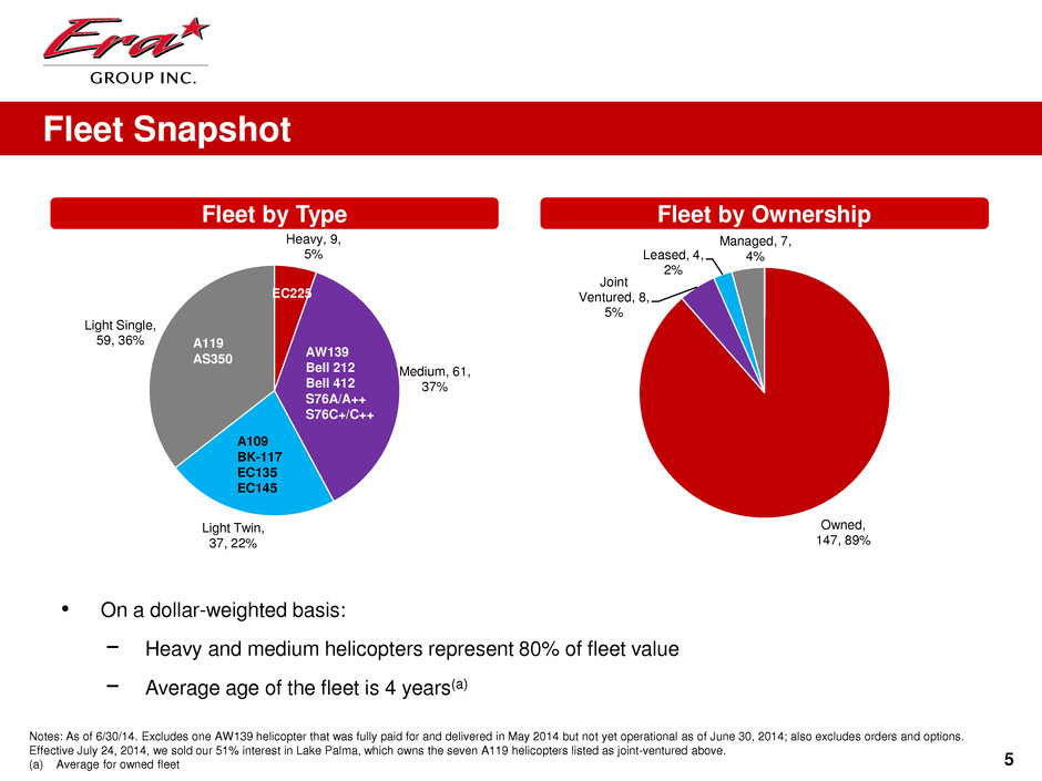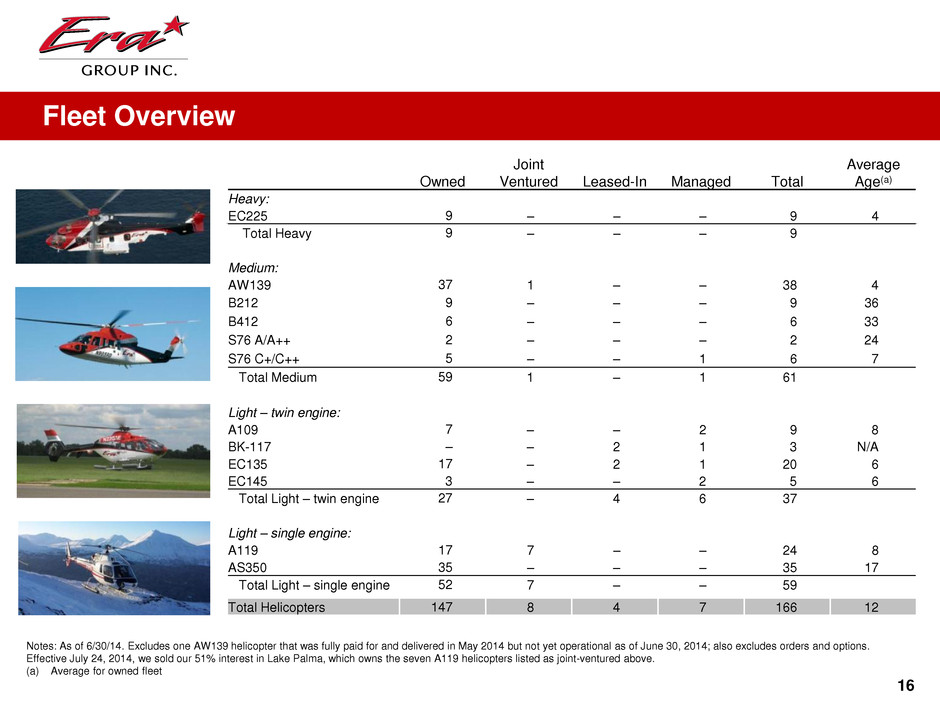 16 Owned Joint Ventured Leased-In Managed Total Average Age(a) Heavy: EC225 9 – – – 9 4 Total Heavy 9 – – – 9 Medium: AW139 37 1 – – 38 4 B212 9 – – – 9 36 B412 6 – – – 6 33 S76 A/A++ 2 – – – 2 24 S76 C+/C++ 5 – – 1 6 7 Total Medium 59 1 – 1 61 Light – twin engine: A109 7 – – 2 9 8 BK-117 – – 2 1 3 N/A EC135 17 – 2 1 20 6 EC145 3 – – 2 5 6 Total Light – twin engine 27 – 4 6 37 Light – single engine: A119 17 7 – – 24 8 AS350 35 – – – 35 17 Total Light – single engine 52 7 – – 59 Total Helicopters 147 8 4 7 166 12 Notes: As of 6/30/14. Excludes one AW139 helicopter that was fully paid for and delivered in May 2014 but not yet operational as of June 30, 2014; also excludes orders and options. Effective July 24, 2014, we sold our 51% interest in Lake Palma, which owns the seven A119 helicopters listed as joint-ventured above. (a) Average for owned fleet Fleet Overview