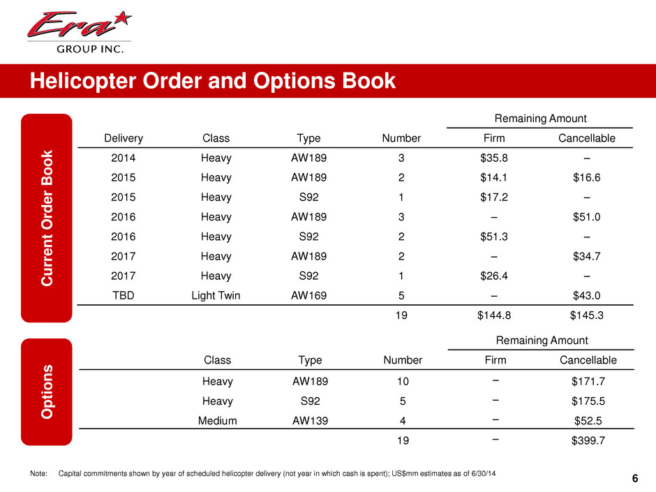 Heavy, 9, 5% Medium, 61, 37% Light Twin, 37, 22% Light Single, 59, 36% 5 Fleet Snapshot • On a dollar-weighted basis: − Heavy and medium helicopters represent 80% of fleet value − Average age of the fleet is 4 years(a) Fleet by Type Fleet by Ownership A119 AS350 AW139 Bell 212 Bell 412 S76A/A++ S76C+/C++ A109 BK-117 EC135 EC145 EC225 Owned, 147, 89% Joint Ventured, 8, 5% Leased, 4, 2% Managed, 7, 4% Notes: As of 6/30/14. Excludes one AW139 helicopter that was fully paid for and delivered in May 2014 but not yet operational as of June 30, 2014; also excludes orders and options. Effective July 24, 2014, we sold our 51% interest in Lake Palma, which owns the seven A119 helicopters listed as joint-ventured above. (a) Average for owned fleet