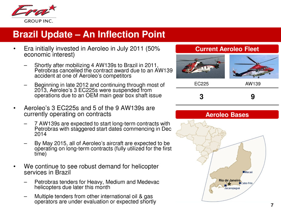 6 C ur re nt O rd er B oo k O pt io ns Delivery Class Type Number Remaining Amount Firm Cancellable 2014 Heavy AW189 3 $35.8 – 2015 Heavy AW189 2 $14.1 $16.6 2015 Heavy S92 1 $17.2 – 2016 Heavy AW189 3 – $51.0 2016 Heavy S92 2 $51.3 – 2017 Heavy AW189 2 – $34.7 2017 Heavy S92 1 $26.4 – TBD Light Twin AW169 5 – $43.0 19 $144.8 $145.3 Note: Capital commitments shown by year of scheduled helicopter delivery (not year in which cash is spent); US$mm estimates as of 6/30/14 Class Type Number Remaining Amount Firm Cancellable Heavy AW189 10 – $171.7 Heavy S92 5 – $175.5 Medium AW139 4 – $52.5 19 – $399.7 Helicopter Order and Options Book