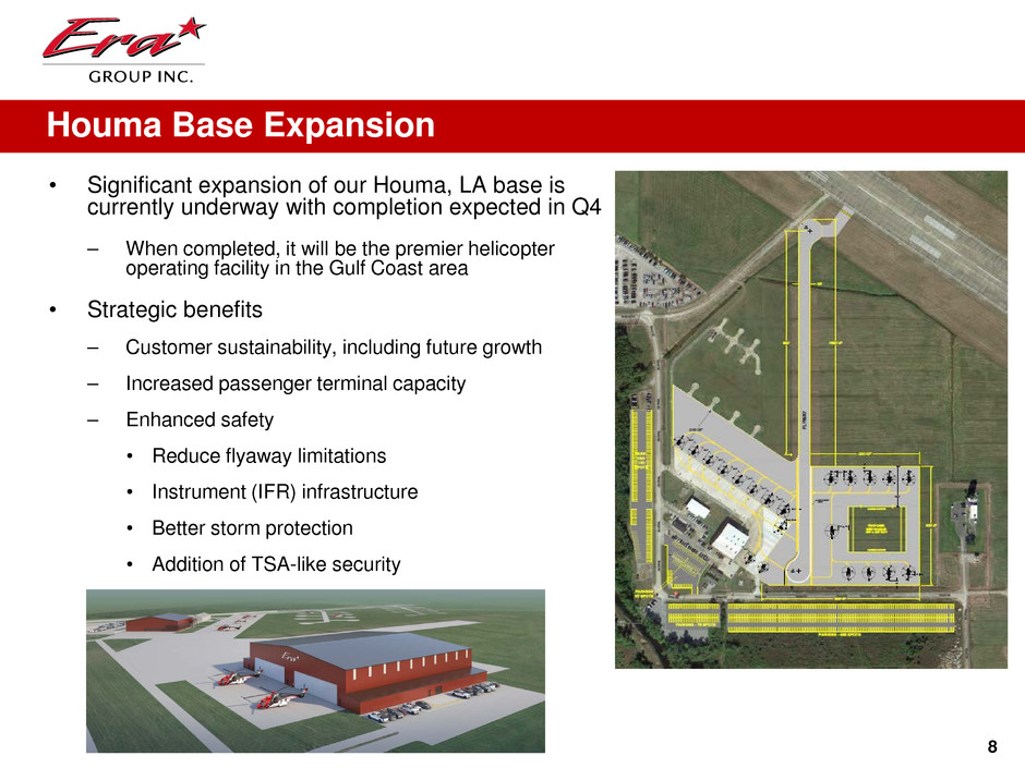• Era initially invested in Aeroleo in July 2011 (50% economic interest) – Shortly after mobilizing 4 AW139s to Brazil in 2011, Petrobras cancelled the contract award due to an AW139 accident at one of Aeroleo’s competitors – Beginning in late 2012 and continuing through most of 2013, Aeroleo’s 3 EC225s were suspended from operations due to an OEM main gear box shaft issue • Aeroleo’s 3 EC225s and 5 of the 9 AW139s are currently operating on contracts – 7 AW139s are expected to start long-term contracts with Petrobras with staggered start dates commencing in Dec 2014 – By May 2015, all of Aeroleo’s aircraft are expected to be operating on long-term contracts (fully utilized for the first time) • We continue to see robust demand for helicopter services in Brazil – Petrobras tenders for Heavy, Medium and Medevac helicopters due later this month – Multiple tenders from other international oil & gas operators are under evaluation or expected shortly Brazil Update – An Inflection Point 7 Current Aeroleo Fleet EC225 AW139 3 9 Aeroleo Bases Rio de Janeiro