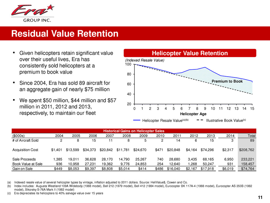 10 Stable and Growing End Markets Demand has grown through periods of economic and price volatility Global Deepwater Platform With Helipad Count Offshore Spending(a) ($bn) (a) Excludes costs for capital equipment, offshore and subsea infrastructure and seismic exploration Source: IHS, Wall Street research • ~75% of Era’s operating fleet is servicing production, pipelines, and government services, the more stable parts of the industry • Once installed, production platforms are economic to operate in almost any commodity price environment 109 124 134 145 159 171 176 182 189 200 201 209 219 100 125 150 175 200 225 2005 2006 2007 2008 2009 2010 2011 2012 2013 2014E 2015E 2016E 2017E – $50 $100 $150 $200 2008 2009 2010 2011 2012 2013 2014E 2015E Jackups Floaters