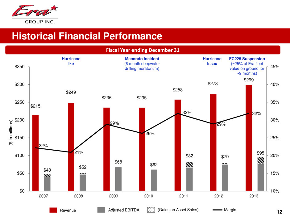 11 Residual Value Retention (a) Indexed resale value of several helicopter types by vintage, inflation adjusted to 2011 dollars. Source: HeliValue$, Cowen and Co. (b) Index includes: Augusta Westland 109A Widebody (1988 model), Bell 212 (1979 model), Bell 412 (1984 model), Eurocopter BK 117A-4 (1988 model), Eurocopter AS 350B (1982 model), Sikorsky S-76A Mark II (1982 model) (c) Era depreciates its helicopters to 40% salvage value over 15 years • Given helicopters retain significant value over their useful lives, Era has consistently sold helicopters at a premium to book value • Since 2004, Era has sold 89 aircraft for an aggregate gain of nearly $75 million • We spent $50 million, $44 million and $57 million in 2011, 2012 and 2013, respectively, to maintain our fleet Helicopter Value Retention 20 40 60 80 100 0 1 2 3 4 5 6 7 8 9 10 11 12 13 14 15 Helicopter Age (Indexed Resale Value) Premium to Book Helicopter Resale Value(a)(b) Illustrative Book Value(c) Historical Gains on Helicopter Sales ($000s) 2004 2005 2006 2007 2008 2009 2010 2011 2012 2013 2014 Total # of Aircraft Sold 2 8 15 11 8 5 2 14 6 15 3 89 Acquisition Cost $1,401 $13,599 $34,373 $20,842 $11,781 $24,670 $471 $20,848 $4,164 $74,296 $2,317 $208,762 Sale Proceeds 1,385 19,011 36,628 28,170 14,790 25,267 740 28,680 3,435 68,165 6,950 233,221 Book Value at Sale 936 10,958 27,231 19,362 9,776 24,853 254 12,640 1,268 50,247 931 158,457 Gain on Sale $449 $8,053 $9,397 $8,808 $5,014 $414 $486 $16,040 $2,167 $17,918 $6,019 $74,764