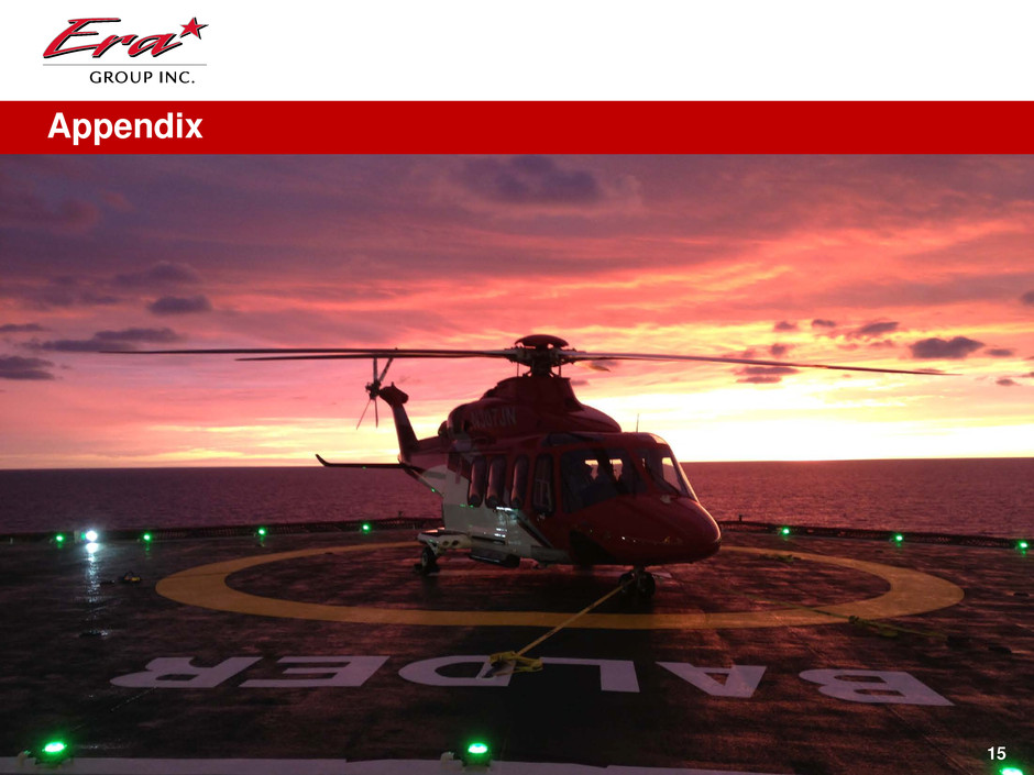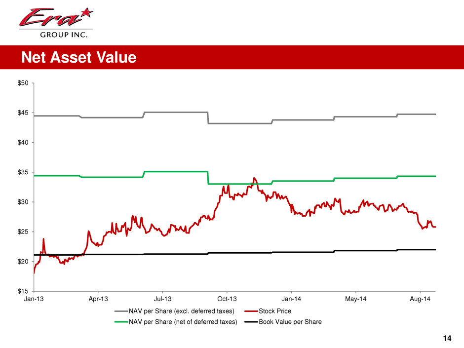 13 • Era continues to generate substantial free cash flow before growth capex • Flexibility to deploy capital for attractive opportunities ̶ growth via organic capex or strategic acquisitions ̶ return of capital to shareholders • On August 14, 2014, Era announced that its Board of Directors authorized the repurchase of up to $25 million in value of its common stock • Existing capital commitments can be funded via combination of cash-on-hand, cash flow from operations and temporary borrowings under our revolving credit facility June 30, 2014 ($000s) Cash and cash equivalents $14,940 Credit facility $55,000 Promissory notes 28,819 Total secured debt $83,819 7.750% Senior Notes $200,000 Total debt $283,819 Net debt $268,879 Shareholders' Equity $448,869 Total capitalization $732,688 Total Debt / Adjusted EBITDA 3.2x Adjusted EBITDA / Interest Expense 5.7x Net Debt / Net Capitalization 37% Total Debt / Total capitalization 39% Available under credit facility $244,325 Capitalization and Financial Policy