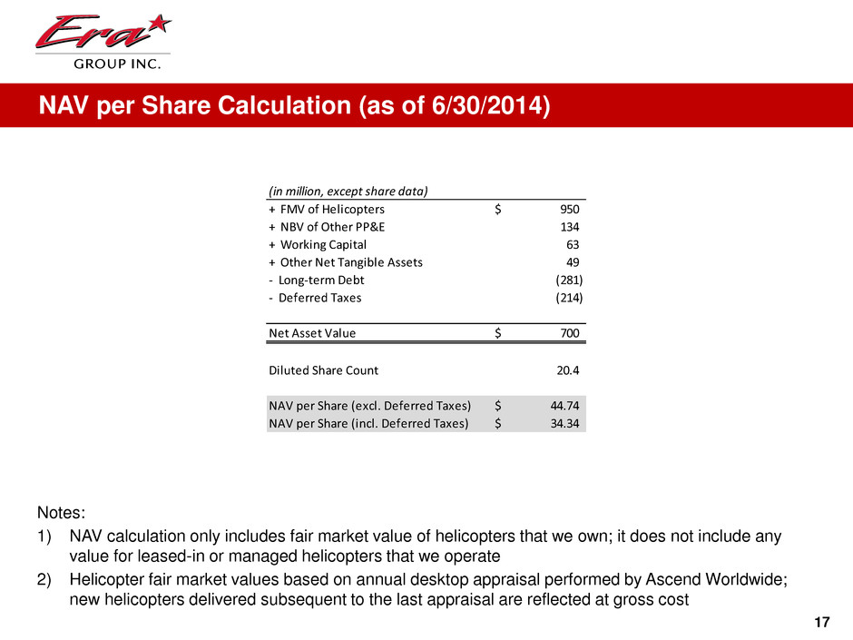 17 Notes: 1) NAV calculation only includes fair market value of helicopters that we own; it does not include any value for leased-in or managed helicopters that we operate 2) Helicopter fair market values based on annual desktop appraisal performed by Ascend Worldwide; new helicopters delivered subsequent to the last appraisal are reflected at gross cost NAV per Share Calculation (as of 6/30/2014) (in million, except share data) + FMV of Helicopters 950$ + NBV of Other PP&E 134 + Working Capital 63 + Other Net Tangible Assets 49 - Long-term Debt (281) - Deferred Taxes (214) Net Asset Value 700$ Diluted Share Count 20.4 NAV per Share (excl. Deferred Taxes) 44.74$ NAV per Share (incl. Deferred Taxes) 34.34$