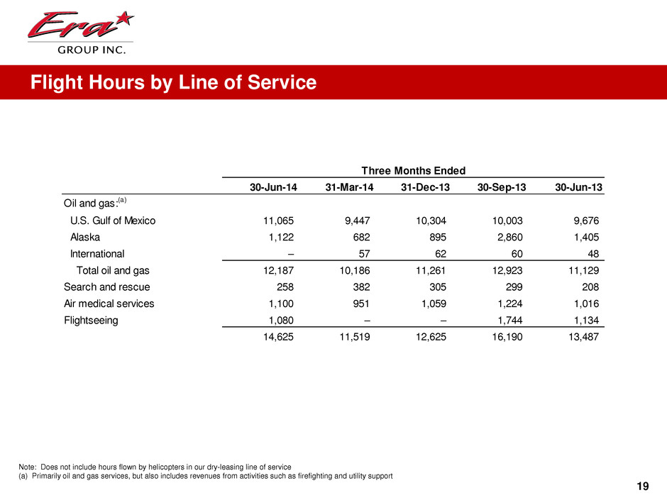 18 (a) Primarily oil and gas services, but also includes revenues from activities such as firefighting and utility support Operating Revenues by Line of Service Three Months Ended ($000s) 30-Jun-14 31-Mar-14 31-Dec-13 30-Sep-13 30-Jun-13 Oil and gas:(a) U.S. Gulf of Mexico $51,715 $49,141 $45,435 $40,503 $38,443 Alaska 9,305 6,197 6,885 14,003 9,398 International 173 1,245 1,228 1,248 1,278 Total oil and gas $61,193 $56,583 $53,548 $55,754 $49,119 Dry-Leasing 11,466 10,876 11,566 10,376 13,074 Search and rescue 5,095 6,152 5,417 4,614 3,466 Air medical services 3,137 3,091 3,135 3,288 3,131 Flightseeing 2,946 – – 4,390 2,794 FBO 2,858 2,842 2,434 2,671 2,782 Eliminations (115) (101) (102) (96) (129) $86,580 $79,443 $75,998 $80,997 $74,237