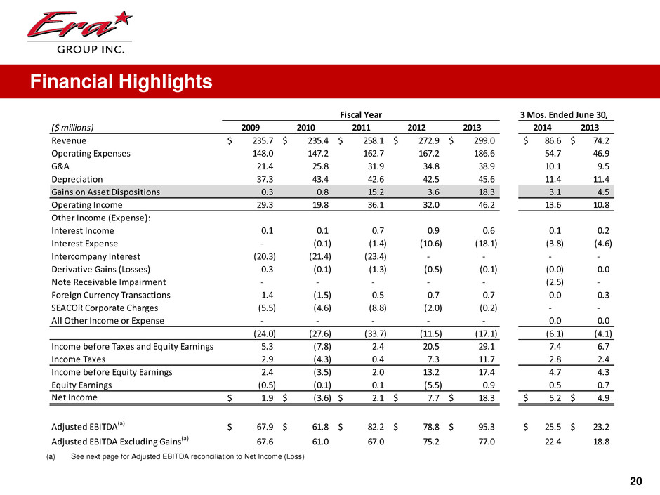 19 Note: Does not include hours flown by helicopters in our dry-leasing line of service (a) Primarily oil and gas services, but also includes revenues from activities such as firefighting and utility support Flight Hours by Line of Service Three Months Ended 30-Jun-14 31-Mar-14 31-Dec-13 30-Sep-13 30-Jun-13 Oil and gas:(a) U.S. Gulf of Mexico 11,065 9,447 10,304 10,003 9,676 Alaska 1,122 682 895 2,860 1,405 International – 57 62 60 48 Total oil and gas 12,187 10,186 11,261 12,923 11,129 Search and rescue 258 382 305 299 208 Air medical services 1,100 951 1,059 1,224 1,016 Flightseeing 1,080 – – 1,744 1,134 14,625 11,519 12,625 16,190 13,487