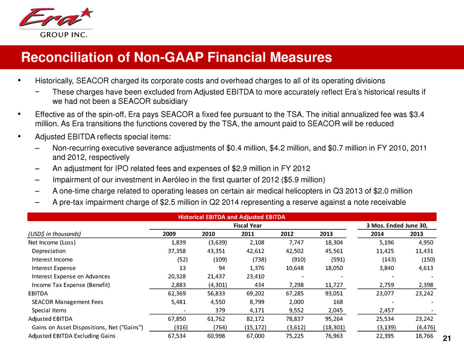 20 (a) See next page for Adjusted EBITDA reconciliation to Net Income (Loss) Fiscal Year 3 Mos. Ended June 30, ($ millions) 2009 2010 2011 2012 2013 2014 2013 Revenue 235.7$ 235.4$ 258.1$ 272.9$ 299.0$ 86.6$ 74.2$ Operating Expenses 148.0 147.2 162.7 167.2 186.6 54.7 46.9 G&A 21.4 25.8 31.9 34.8 38.9 10.1 9.5 Depreciation 37.3 43.4 42.6 42.5 45.6 11.4 11.4 Gains on Asset Dispositions 0.3 0.8 15.2 3.6 18.3 3.1 4.5 Operating Income 29.3 19.8 36.1 32.0 46.2 13.6 10.8 Other Income (Expense): Interest Income 0.1 0.1 0.7 0.9 0.6 0.1 0.2 Interest Expense - (0.1) (1.4) (10.6) (18.1) (3.8) (4.6) Intercompany Interest (20.3) (21.4) (23.4) - - - - Derivative Gains (Losses) 0.3 (0.1) (1.3) (0.5) (0.1) (0.0) 0.0 Note Receivable Impairment - - - - - (2.5) - Foreign Currency Transactions 1.4 (1.5) 0.5 0.7 0.7 0.0 0.3 SEACOR Corporate Charges (5.5) (4.6) (8.8) (2.0) (0.2) - - All Other Income or Expense - - - - - 0.0 0.0 (24.0) (27.6) (33.7) (11.5) (17.1) (6.1) (4.1) Income before Taxes and Equity Earnings 5.3 (7.8) 2.4 20.5 29.1 7.4 6.7 Income Taxes 2.9 (4.3) 0.4 7.3 11.7 2.8 2.4 Income before Equity Earnings 2.4 (3.5) 2.0 13.2 17.4 4.7 4.3 Equity Earnings (0.5) (0.1) 0.1 (5.5) 0.9 0.5 0.7 Net Income 1.9$ (3.6)$ 2.1$ 7.7$ 18.3$ 5.2$ 4.9$ Adjusted EBITDA(a) 67.9$ 61.8$ 82.2$ 78.8$ 95.3$ 25.5$ 23.2$ Adjusted EBITDA Excluding Gains(a) 67.6 61.0 67.0 75.2 77.0 22.4 18.8 Financial Highlights