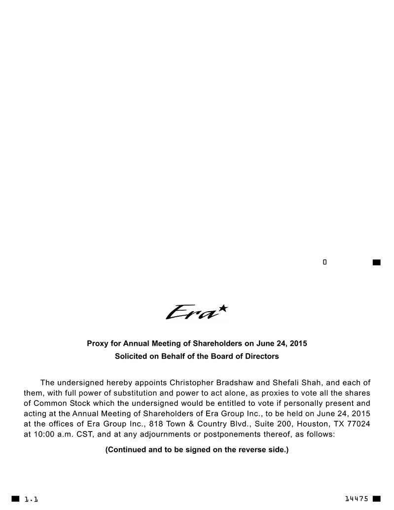 0 ------------------ . . . . . . . . . . . . . . . . . . . . . . . . . . . . . . . . . . . . . . . . . . . . . . . . . . . . . . ---------------- 14475 proxy for annual meeting of shareholders on June 24, 2015solicited on Behalf of the Board of directors The undersigned hereby appoints Christopher Bradshaw and Shefali Shah, and each ofthem, with full power of substitution and power to act alone, as proxies to vote all the sharesof Common Stock which the undersigned would be entitled to vote if personally present andacting at the Annual Meeting of Shareholders of Era Group Inc., to be held on June 24, 2015at the offices of Era Group Inc., 818 Town & Country Blvd., Suite 200, Houston, TX 77024at 10:00 a.m. CST, and at any adjournments or postponements thereof, as follows:(continued and to be signed on the reverse side.) 1.1