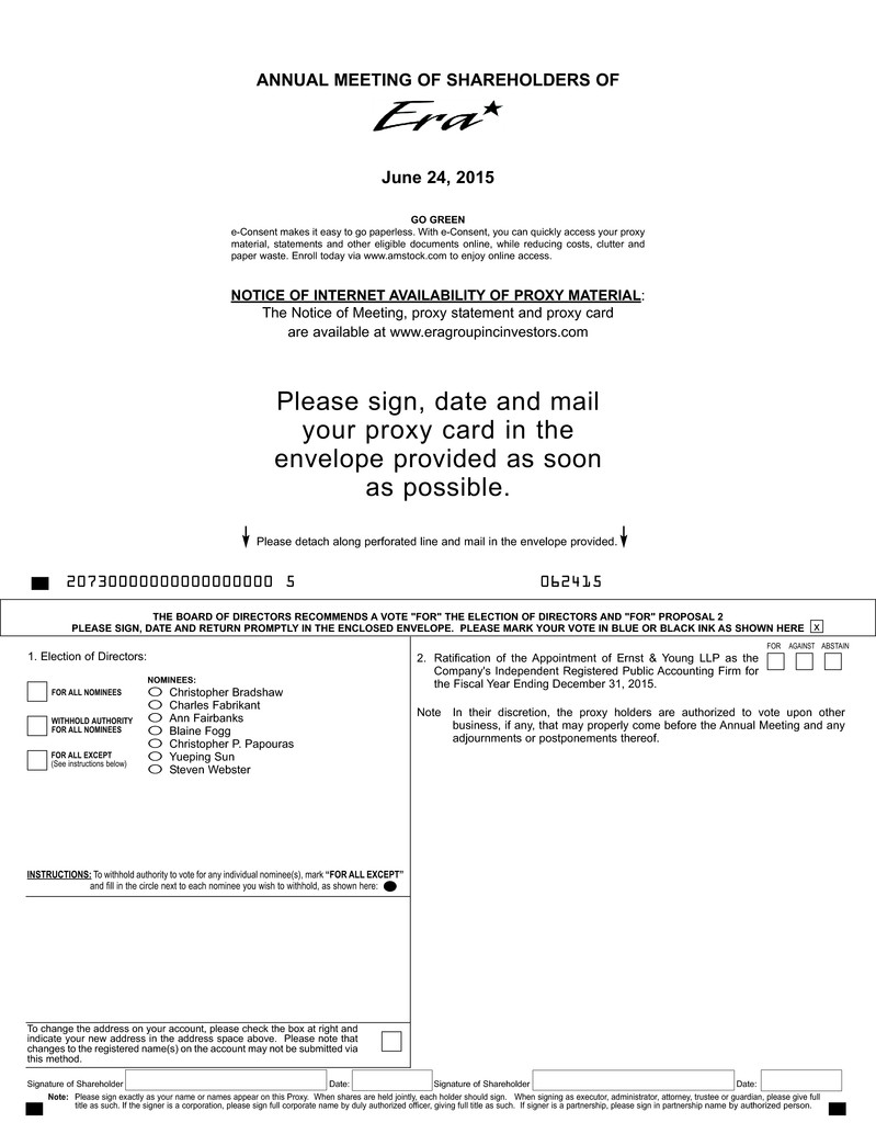 Signature of Shareholder Date: Signature of Shareholder Date:Note: Please sign exactly as your name or names appear on this Proxy. When shares are held jointly, each holder should sign. When signing as executor, administrator, attorney, trustee or guardian, please give fulltitle as such. If the signer is a corporation, please sign full corporate name by duly authorized officer, giving full title as such. If signer is a partnership, please sign in partnership name by authorized person. To change the address on your account, please check the box at right andindicate your new address in the address space above. Please note thatchanges to the registered name(s) on the account may not be submitted viathis method. INSTRUCTIONS: To withhold authority to vote for any individual nominee(s), mark “FOR ALL EXCEPT”and fill in the circle next to each nominee you wish to withhold, as shown here: JOhN smiTh1234 maiN sTREETapT. 203NEW YORK, NY 10038 aNNUal mEETiNG Of shaREhOldERs Of June 24, 2015 iNTERNET - Access “www.voteproxy.com” and follow the on-screeninstructions or scan the QR code with your smartphone. Have yourproxy card available when you access the web page.TElEphONE - Call toll-free 1-800-pROXiEs (1-800-776-9437) inthe United States or 1-718-921-8500 from foreign countries from anytouch-tone telephone and follow the instructions. Have your proxycard available when you call.Vote online/phone until 11:59 PM EST the day before the meeting. mail - Sign, date and mail your proxy card in the envelopeprovided as soon as possible.iN pERsON - You may vote your shares in person by attendingthe Annual Meeting.GO GREEN - e-Consent makes it easy to go paperless. Withe-Consent, you can quickly access your proxy material, statementsand other eligible documents online, while reducing costs, clutterand paper waste. Enroll today via www.amstock.com to enjoy onlineaccess. pROXY vOTiNG iNsTRUcTiONs Please detach along perforated line and mail in the envelope provided IF you are not voting via telephone or the Internet. ThE BOaRd Of diREcTORs REcOmmENds a vOTE "fOR" ThE ElEcTiON Of diREcTORs aNd "fOR" pROpOsal 2plEasE siGN, daTE aNd RETURN pROmpTlY iN ThE ENclOsEd ENvElOpE. plEasE maRK YOUR vOTE iN BlUE OR BlacK iNK as shOWN hERE x ------------------ ---------------- cOmpaNY NUmBER accOUNT NUmBER NOTicE Of iNTERNET availaBiliTY Of pROXY maTERial: The Notice of Meeting, proxy statement and proxycard are available at www.eragroupincinvestors.com 1. Election of Directors: O Christopher BradshawO Charles FabrikantO Ann FairbanksO Blaine FoggO Christopher P. PapourasO Yueping SunO Steven Webster 2. Ratification of the Appointment of Ernst & Young LLP as theCompany's Independent Registered Public Accounting Firm forthe Fiscal Year Ending December 31, 2015. Note In their discretion, the proxy holders are authorized to vote upon other business, if any, that may properly come before the Annual Meeting and anyadjournments or postponements thereof. FOR AGAINST ABSTAIN FOR ALL NOMINEES WITHHOLD AUTHORITY FOR ALL NOMINEES FOR ALL EXCEPT(See instructions below) NOmiNEEs: 20730000000000000000 5 062415