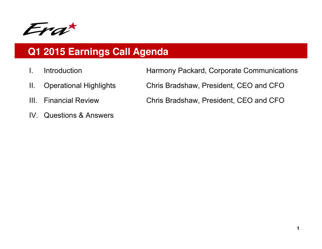 I. Introduction Harmony Packard, Corporate Communications II. Operational Highlights Chris Bradshaw, President, CEO and CFO III. Financial Review Chris Bradshaw, President, CEO and CFO IV. Questions & Answers Q1 2015 Earnings Call Agenda 1