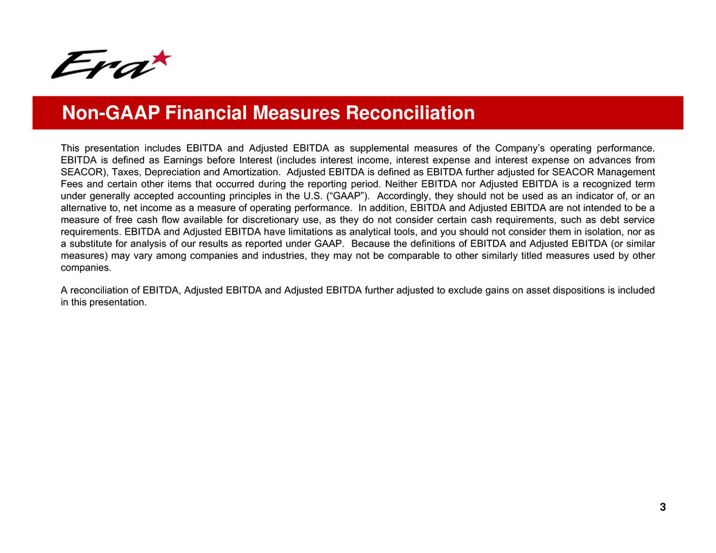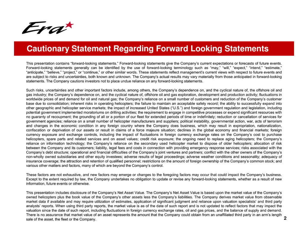 2 This presentation contains “forward-looking statements.” Forward-looking statements give the Company’s current expectations or forecasts of future events. Forward-looking statements generally can be identified by the use of forward-looking terminology such as “may,” “will,” “expect,” “intend,” “estimate,” “anticipate,” “believe,” “project,” or “continue,” or other similar words. These statements reflect management’s current views with respect to future events and are subject to risks and uncertainties, both known and unknown. The Company’s actual results may vary materially from those anticipated in forward-looking statements. The Company cautions investors not to place undue reliance on any forward-looking statements. Such risks, uncertainties and other important factors include, among others, the Company’s dependence on, and the cyclical nature of, the offshore oil and gas industry; the Company’s dependence on, and the cyclical nature of, offshore oil and gas exploration, development and production activity; fluctuations in worldwide prices of and demand for oil and natural gas; the Company’s reliance on a small number of customers and reduction of the Company’s customer base due to consolidation; inherent risks in operating helicopters; the failure to maintain an acceptable safety record; the ability to successfully expand into other geographic and helicopter service markets; the impact of increased United States (“U.S.”) and foreign government regulation and legislation, including potential government implemented moratoriums on drilling activities; the requirement to engage in competitive processes or expend significant resources with no guaranty of recoupment; the grounding of all or a portion of our fleet for extended periods of time or indefinitely; reduction or cancellation of services for government agencies; reliance on a small number of helicopter manufacturers and suppliers; political instability, governmental action, war, acts of terrorism and changes in the economic condition in any foreign country where the Company does business, which may result in expropriation, nationalization, confiscation or deprivation of our assets or result in claims of a force majeure situation; declines in the global economy and financial markets; foreign currency exposure and exchange controls, including the impact of fluctuations in foreign currency exchange rates on the Company’s cost to purchase helicopters, spare parts and related services and on asset values; credit risk exposure; the ongoing need to replace aging helicopters; the Company’s reliance on information technology; the Company’s reliance on the secondary used helicopter market to dispose of older helicopters; allocation of risk between the Company and its customers; liability, legal fees and costs in connection with providing emergency response services; risks associated with the Company’s debt structure; operational and financial difficulties of the Company’s joint ventures and partners; conflict with the other owners of the Company’s non-wholly owned subsidiaries and other equity investees; adverse results of legal proceedings; adverse weather conditions and seasonality; adequacy of insurance coverage; the attraction and retention of qualified personnel; restrictions on the amount of foreign ownership of the Company’s common stock; and various other matters and factors, many of which are beyond the Company’s control. These factors are not exhaustive, and new factors may emerge or changes to the foregoing factors may occur that could impact the Company’s business. Except to the extent required by law, the Company undertakes no obligation to update or revise any forward-looking statements, whether as a result of new information, future events or otherwise. This presentation includes disclosure of the Company’s Net Asset Value. The Company’s Net Asset Value is based upon the market value of the Company’s owned helicopters plus the book value of the Company’s other assets less the Company’s liabilities. The Company derives market value from observable market data if available and may require utilization of estimates, application of significant judgment and reliance upon valuation specialists’ and third party analysts’ reports. When using third party reports, the market value is as of the date of such report and is not updated to reflect factors that may impact the valuation since the date of such report, including fluctuations in foreign currency exchange rates, oil and gas prices, and the balance of supply and demand. There is no assurance that market value of an asset represents the amount that the Company could obtain from an unaffiliated third party in an arm’s length sale of the asset, the fleet or the Company. Cautionary Statement Regarding Forward Looking Statements