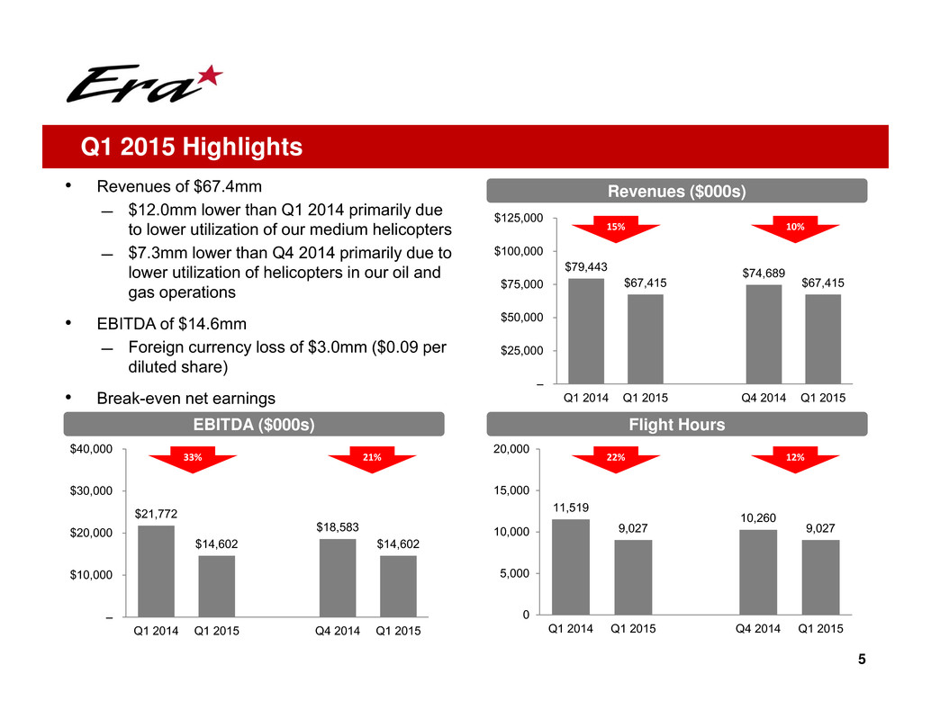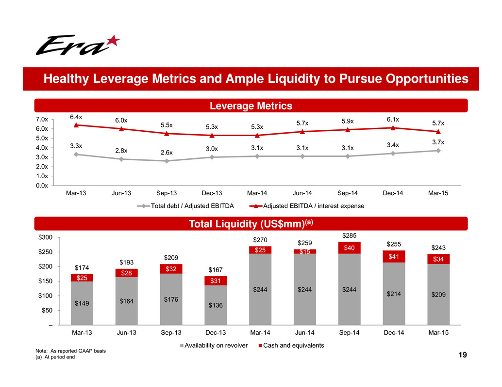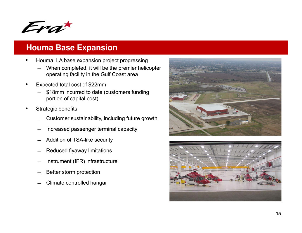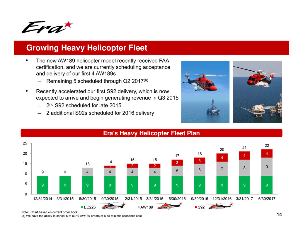 9 9 9 9 9 9 9 9 9 9 9 4 4 4 4 5 6 7 8 9 1 2 2 3 3 4 4 4 9 9 13 14 15 15 17 18 20 21 22 0 5 10 15 20 25 12/31/2014 3/31/2015 6/30/2015 9/30/2015 12/31/2015 3/31/2016 6/30/2016 9/30/2016 12/31/2016 3/31/2017 6/30/2017 EC225 AW189 S92 14 Era’s Heavy Helicopter Fleet Plan • The new AW189 helicopter model recently received FAA certification, and we are currently scheduling acceptance and delivery of our first 4 AW189s ̶ Remaining 5 scheduled through Q2 2017(a) • Recently accelerated our first S92 delivery, which is now expected to arrive and begin generating revenue in Q3 2015 ̶ 2nd S92 scheduled for late 2015 ̶ 2 additional S92s scheduled for 2016 delivery Growing Heavy Helicopter Fleet Note: Chart based on current order book (a) We have the ability to cancel 5 of our 9 AW189 orders at a de minimis economic cost