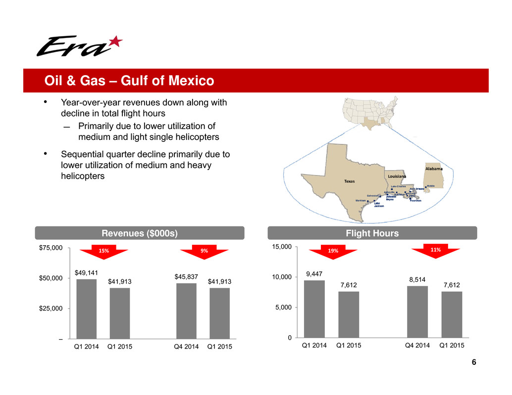 • Revenues of $67.4mm ̶ $12.0mm lower than Q1 2014 primarily due to lower utilization of our medium helicopters ̶ $7.3mm lower than Q4 2014 primarily due to lower utilization of helicopters in our oil and gas operations • EBITDA of $14.6mm ̶ Foreign currency loss of $3.0mm ($0.09 per diluted share) • Break-even net earnings $21,772 $14,602 $18,583 $14,602 – $10,000 $20,000 $30,000 $40,000 Q1 2014 Q1 2015 Q4 2014 Q1 2015 $79,443 $67,415 $74,689 $67,415 – $25,000 $50,000 $75,000 $100,000 $125,000 Q1 2014 Q1 2015 Q4 2014 Q1 2015 11,519 9,027 10,260 9,027 0 5,000 10,000 15,000 20,000 Q1 2014 Q1 2015 Q4 2014 Q1 2015 5 Q1 2015 Highlights Revenues ($000s) EBITDA ($000s) Flight Hours 15% 10% 22% 12%33% 21%
