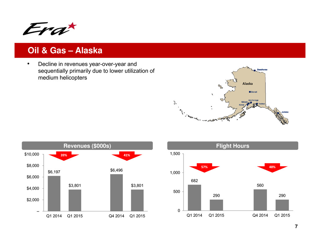 $49,141 $41,913 $45,837 $41,913 – $25,000 $50,000 $75,000 Q1 2014 Q1 2015 Q4 2014 Q1 2015 9,447 7,612 8,514 7,612 0 5,000 10,000 15,000 Q1 2014 Q1 2015 Q4 2014 Q1 2015 6 Oil & Gas – Gulf of Mexico Revenues ($000s) Flight Hours 11% • Year-over-year revenues down along with decline in total flight hours ̶ Primarily due to lower utilization of medium and light single helicopters • Sequential quarter decline primarily due to lower utilization of medium and heavy helicopters 9% 19%15%