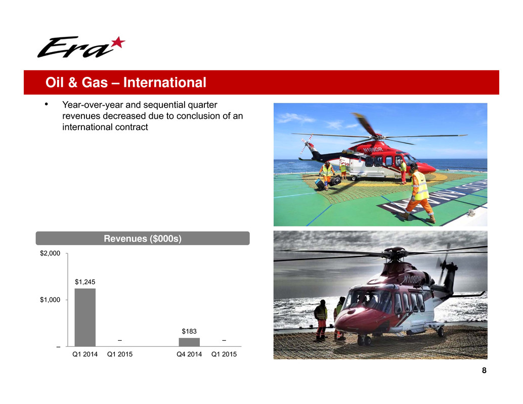 $6,197 $3,801 $6,496 $3,801 – $2,000 $4,000 $6,000 $8,000 $10,000 Q1 2014 Q1 2015 Q4 2014 Q1 2015 7 Oil & Gas – Alaska Revenues ($000s) Flight Hours 48% 39% 41% 57% • Decline in revenues year-over-year and sequentially primarily due to lower utilization of medium helicopters 682 290 560 290 0 500 1,000 1,500 Q1 2014 Q1 2015 Q4 2014 Q1 2015