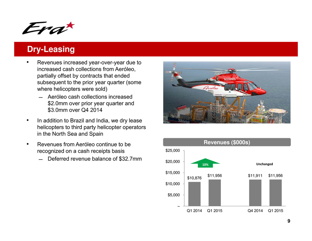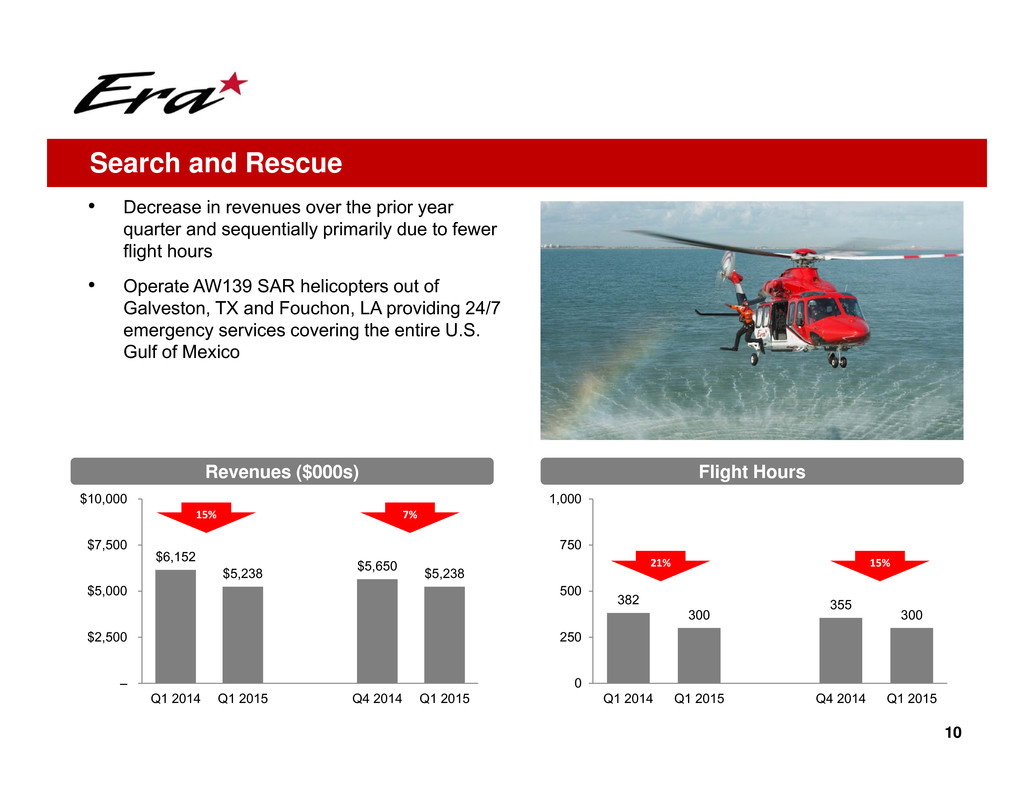 $10,876 $11,956 $11,911 $11,956 – $5,000 $10,000 $15,000 $20,000 $25,000 Q1 2014 Q1 2015 Q4 2014 Q1 2015 9 Dry-Leasing Revenues ($000s) 10% • Revenues increased year-over-year due to increased cash collections from Aeróleo, partially offset by contracts that ended subsequent to the prior year quarter (some where helicopters were sold) ̶ Aeróleo cash collections increased $2.0mm over prior year quarter and $3.0mm over Q4 2014 • In addition to Brazil and India, we dry lease helicopters to third party helicopter operators in the North Sea and Spain • Revenues from Aeróleo continue to be recognized on a cash receipts basis ̶ Deferred revenue balance of $32.7mm Unchanged