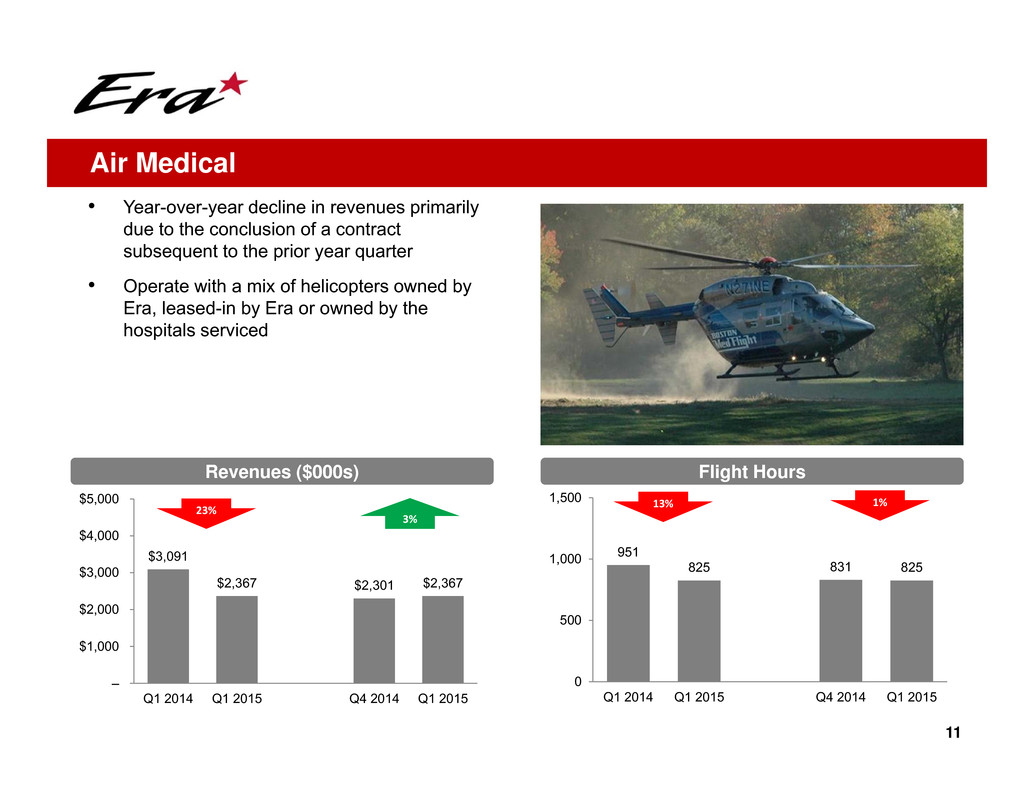 10 Search and Rescue Revenues ($000s) Flight Hours • Decrease in revenues over the prior year quarter and sequentially primarily due to fewer flight hours • Operate AW139 SAR helicopters out of Galveston, TX and Fouchon, LA providing 24/7 emergency services covering the entire U.S. Gulf of Mexico $6,152 $5,238 $5,650 $5,238 – $2,500 $5,000 $7,500 $10,000 Q1 2014 Q1 2015 Q4 2014 Q1 2015 382 300 355 300 0 250 500 750 1,000 Q1 2014 Q1 2015 Q4 2014 Q1 2015 15% 15% 7% 21%