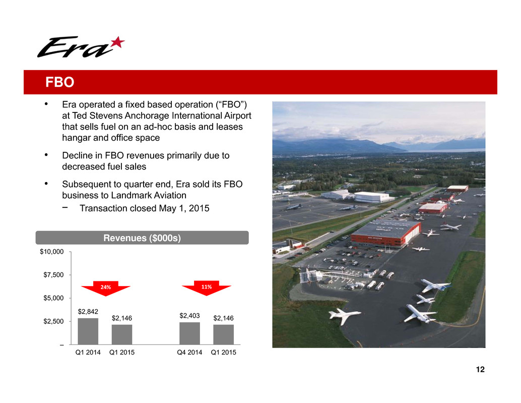 $3,091 $2,367 $2,301 $2,367 – $1,000 $2,000 $3,000 $4,000 $5,000 Q1 2014 Q1 2015 Q4 2014 Q1 2015 951 825 831 825 0 500 1,000 1,500 Q1 2014 Q1 2015 Q4 2014 Q1 2015 11 • Year-over-year decline in revenues primarily due to the conclusion of a contract subsequent to the prior year quarter • Operate with a mix of helicopters owned by Era, leased-in by Era or owned by the hospitals serviced Air Medical Revenues ($000s) Flight Hours 23% 13% 1% 3%