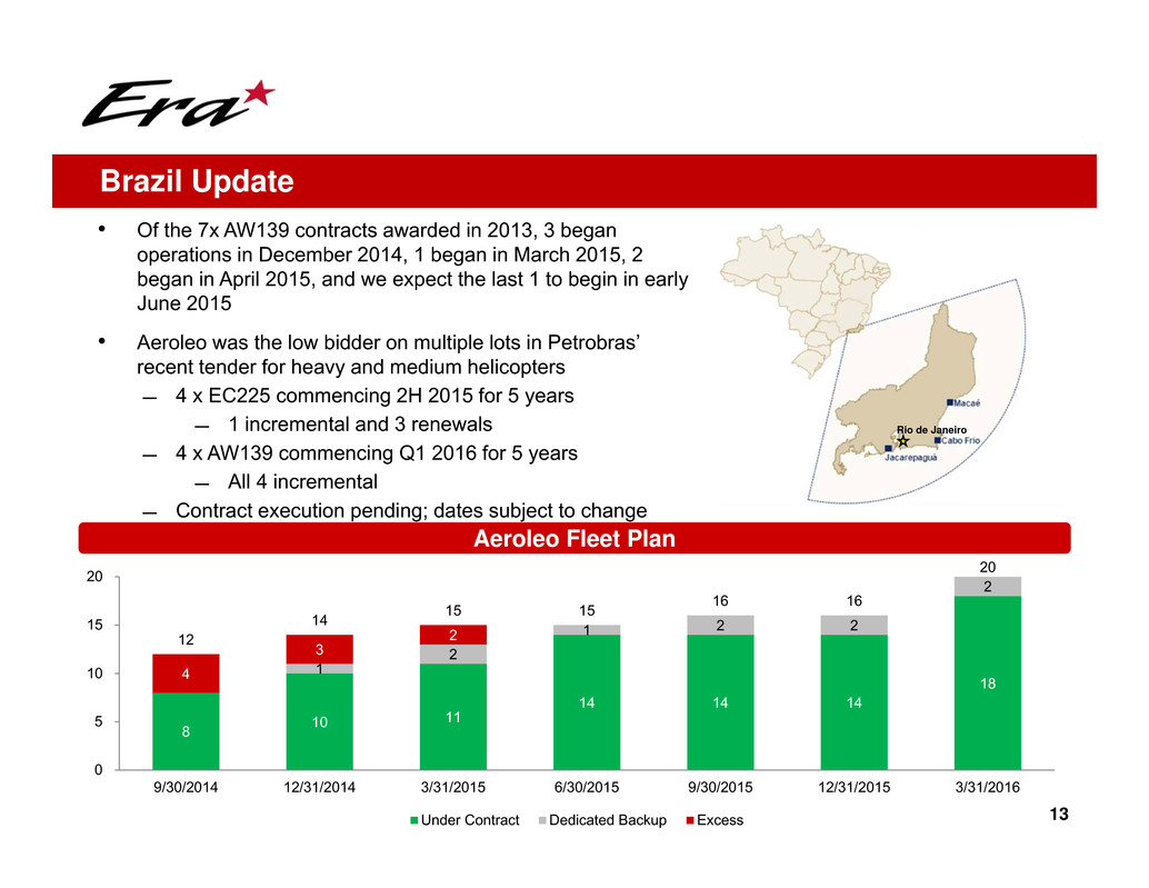 $2,842 $2,146 $2,403 $2,146 – $2,500 $5,000 $7,500 $10,000 Q1 2014 Q1 2015 Q4 2014 Q1 2015 12 • Era operated a fixed based operation (“FBO”) at Ted Stevens Anchorage International Airport that sells fuel on an ad-hoc basis and leases hangar and office space • Decline in FBO revenues primarily due to decreased fuel sales • Subsequent to quarter end, Era sold its FBO business to Landmark Aviation − Transaction closed May 1, 2015 FBO Revenues ($000s) 11%24%