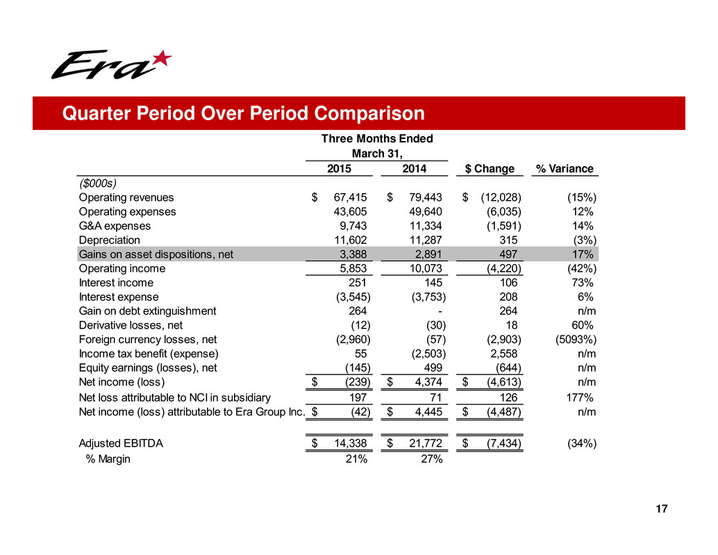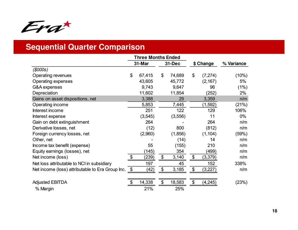 17 Quarter Period Over Period Comparison Three Months Ended March 31, 2015 2014 $ Change % Variance ($000s) Operating revenues 67,415$ 79,443$ (12,028)$ (15%) Operating expenses 43,605 49,640 (6,035) 12% G&A expenses 9,743 11,334 (1,591) 14% Depreciation 11,602 11,287 315 (3%) Gains on asset dispositions, net 3,388 2,891 497 17% Operating income 5,853 10,073 (4,220) (42%) Interest income 251 145 106 73% Interest expense (3,545) (3,753) 208 6% Gain on debt extinguishment 264 - 264 n/m Derivative losses, net (12) (30) 18 60% Foreign currency losses, net (2,960) (57) (2,903) (5093%) Income tax benefit (expense) 55 (2,503) 2,558 n/m Equity earnings (losses), net (145) 499 (644) n/m Net income (loss) (239)$ 4,374$ (4,613)$ n/m Net loss attributable to NCI in subsidiary 197 71 126 177% Net income (loss) attributable to Era Group Inc. (42)$ 4,445$ (4,487)$ n/m Adjusted EBITDA 14,338$ 21,772$ (7,434)$ (34%) % Margin 21% 27%