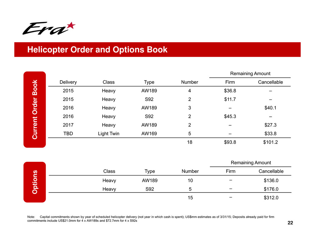 22 C u r r e n t O r d e r B o o k O p t i o n s Delivery Class Type Number Remaining Amount Firm Cancellable 2015 Heavy AW189 4 $36.8 – 2015 Heavy S92 2 $11.7 – 2016 Heavy AW189 3 – $40.1 2016 Heavy S92 2 $45.3 – 2017 Heavy AW189 2 – $27.3 TBD Light Twin AW169 5 – $33.8 18 $93.8 $101.2 Note: Capital commitments shown by year of scheduled helicopter delivery (not year in which cash is spent); US$mm estimates as of 3/31/15; Deposits already paid for firm commitments include US$21.0mm for 4 x AW189s and $72.7mm for 4 x S92s Class Type Number Remaining Amount Firm Cancellable Heavy AW189 10 – $136.0 Heavy S92 5 – $176.0 15 – $312.0 Helicopter Order and Options Book