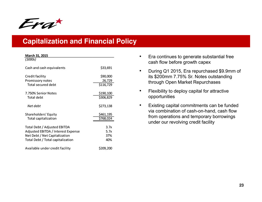 March 31, 2015 ($000s) Cash and cash equivalents $33,691 Credit facility $90,000 Promissory notes 26,729 Total secured debt $116,729 7.750% Senior Notes $190,100 Total debt $306,829 Net debt $273,138 Shareholders' Equity $461,195 Total capitalization $768,024 Total Debt / Adjusted EBITDA 3.7x Adjusted EBITDA / Interest Expense 5.7x Net Debt / Net Capitalization 37% Total Debt / Total capitalization 40% Available under credit facility $209,200 23 • Era continues to generate substantial free cash flow before growth capex • During Q1 2015, Era repurchased $9.9mm of its $200mm 7.75% Sr. Notes outstanding through Open Market Repurchases • Flexibility to deploy capital for attractive opportunities • Existing capital commitments can be funded via combination of cash-on-hand, cash flow from operations and temporary borrowings under our revolving credit facility Capitalization and Financial Policy