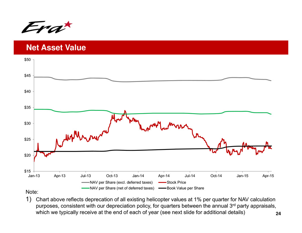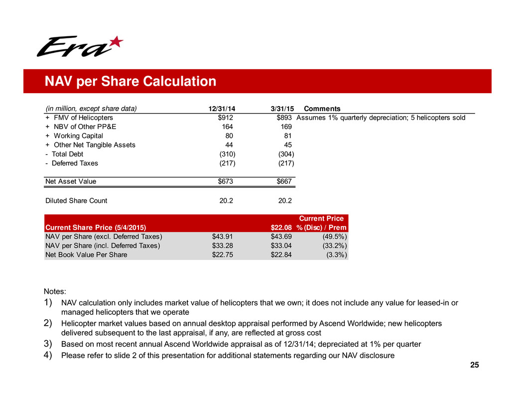 24 Net Asset Value Note: 1) Chart above reflects deprecation of all existing helicopter values at 1% per quarter for NAV calculation purposes, consistent with our depreciation policy, for quarters between the annual 3rd party appraisals, which we typically receive at the end of each of year (see next slide for additional details) $15 $20 $25 $30 $35 $40 $45 $50 Jan-13 Apr-13 Jul-13 Oct-13 Jan-14 Apr-14 Jul-14 Oct-14 Jan-15 NAV per Share (excl. deferred taxes) Stock Price NAV per Share (net of deferred taxes) Book Value per Share - Apr-13 Jul-13 Oct-13 Jan-14 Apr-14 Jul-14 Oct-14 Jan-15 Apr-15
